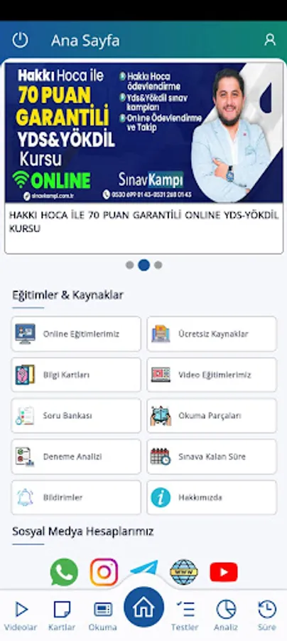 EXAM CAMP Mobile Application is an application that includes vocabulary exercises, reading passages, training videos, tests and guidance tracking system for those who are preparing for English exams (YDS, EYDS, YÖKDİL, IELTS, TOEFL, YDT, ALES) by www.sinavkampi.com.