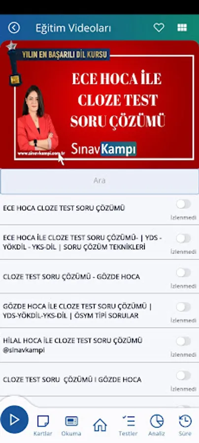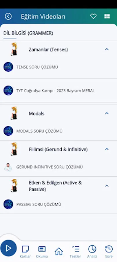 - You can follow the special video contents prepared by the Exam Camp trainers, classified according to their topics and types, from within the application.