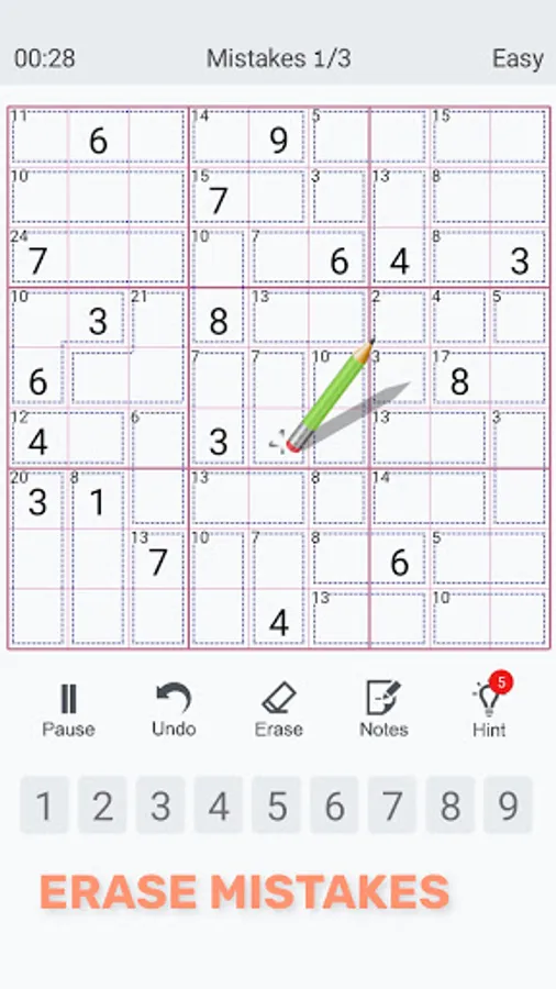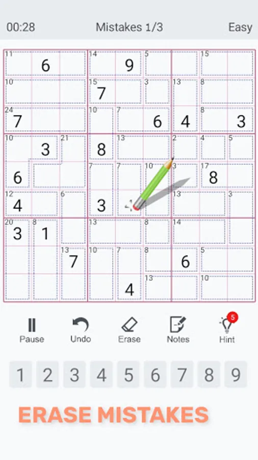 Killer Sudoku is a variation of Sudoku that adds an extra layer of challenge. In addition to filling in the numbers to complete the Sudoku grid, you must also meet the conditions of the killer cells. Killer cells (Cages) are groups of cells that contain a certain sum. The cage refers to cells linked by dotted lines with a number printed in the top left-hand corner, this number must be the sum of cells that forms the cage. So that the cages which have one cell makes the puzzle easier