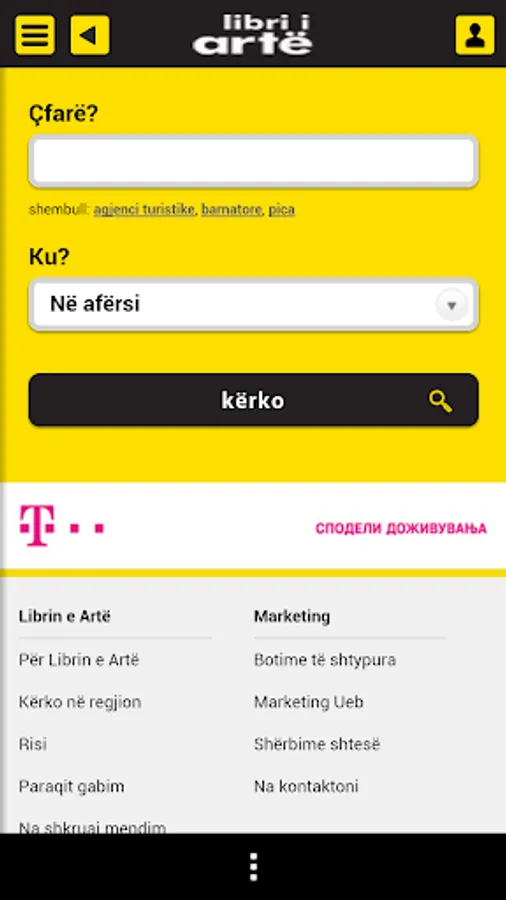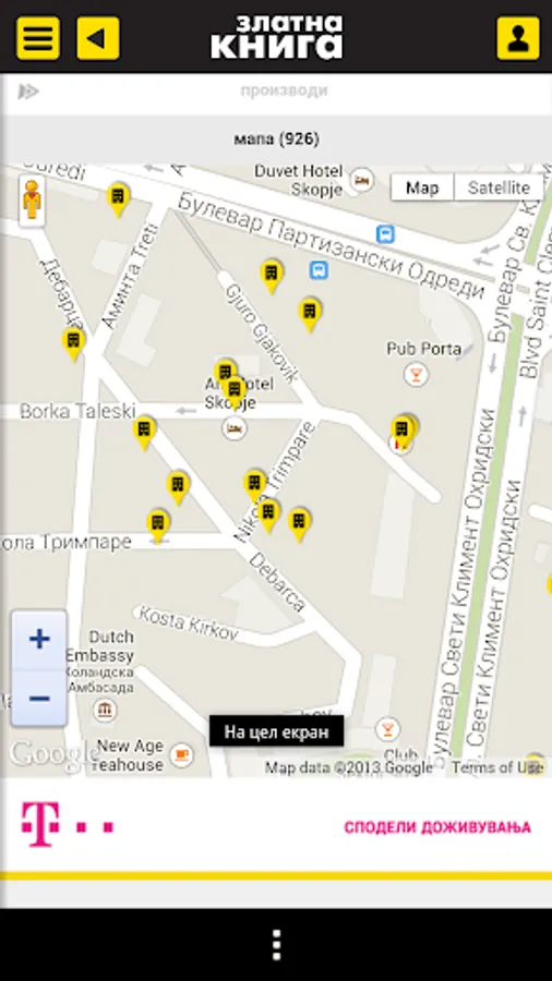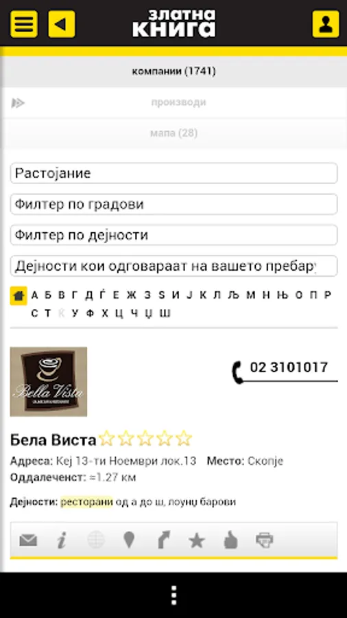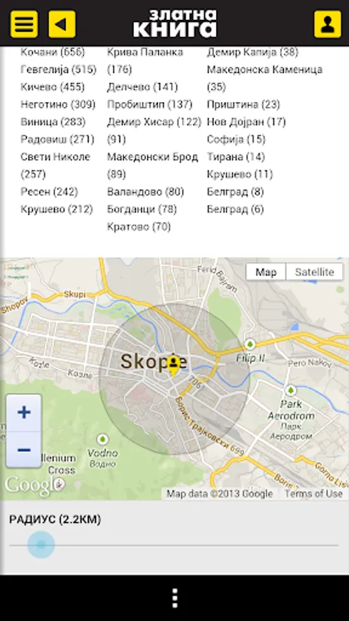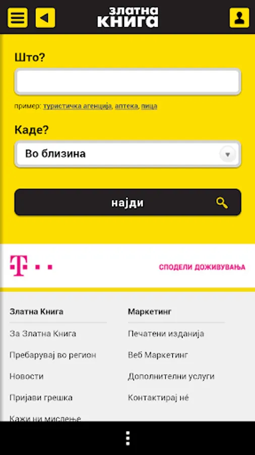 The application provides geo-location search through Zlatna Kniga database of companies and entities in Macedonia.