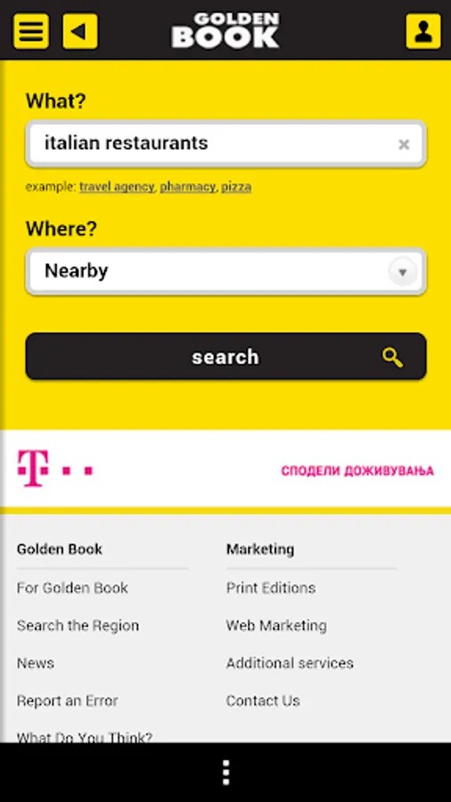 Апликацијата овозможува гео-локациско пребарување на фирми и други правни лица во податоците на Златна Книга.