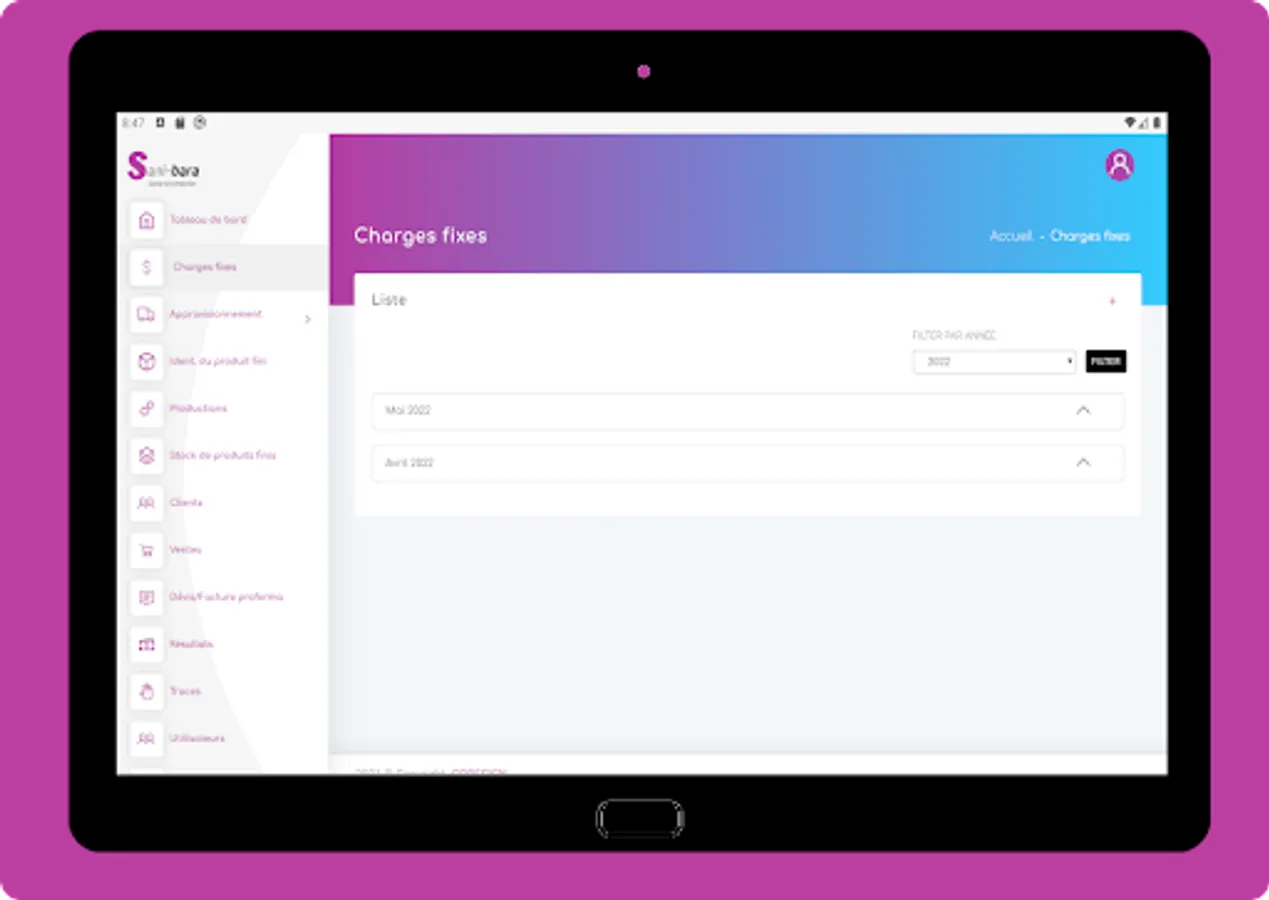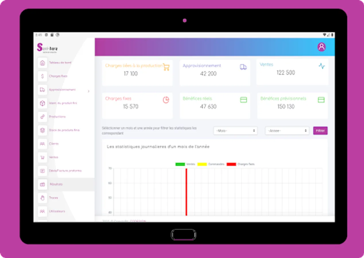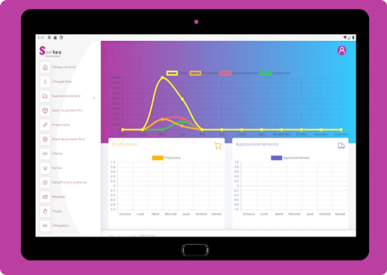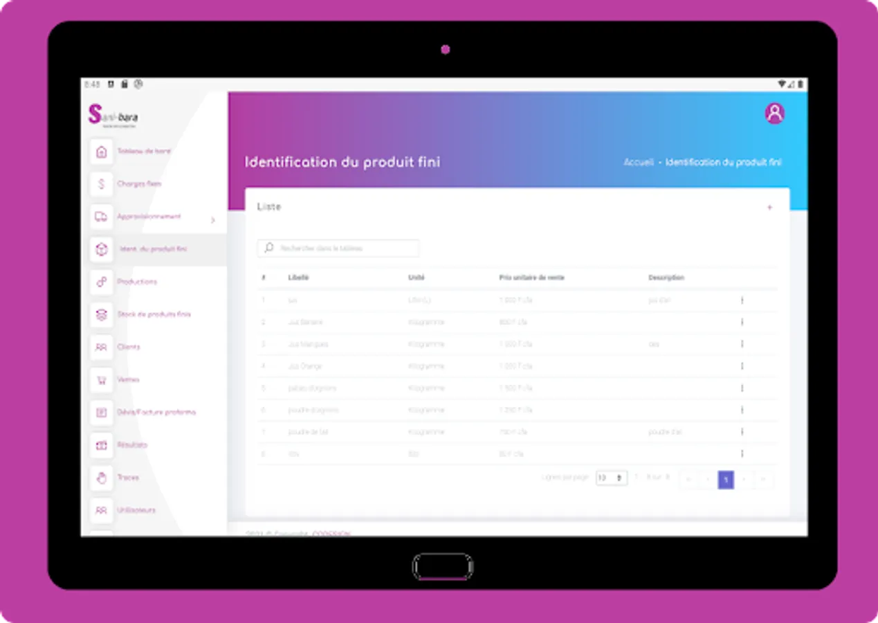 Sani-bara: is a web and mobile production management application. It follows the entire evolution of the process, starting with the purchase of the raw material, its transformation into a finished product, the calculation of other costs and charges, the calculation of the actual and forecast profit and finally the sale of the finished products.