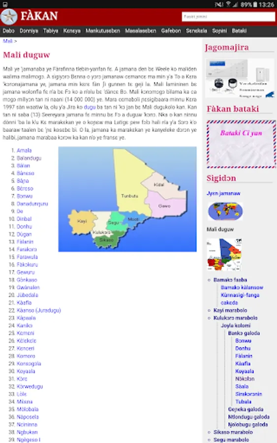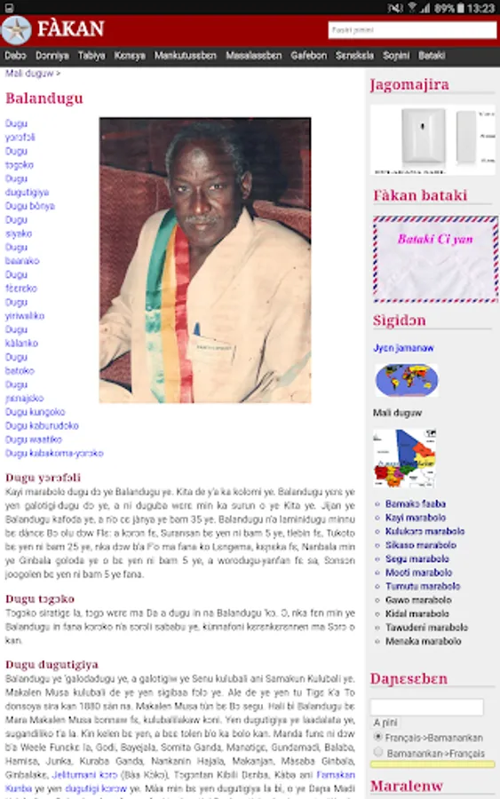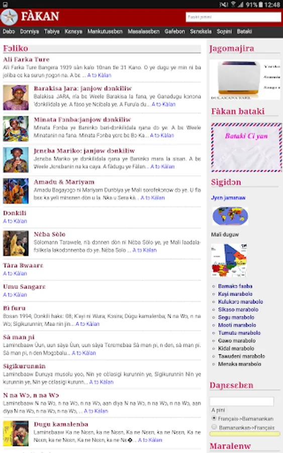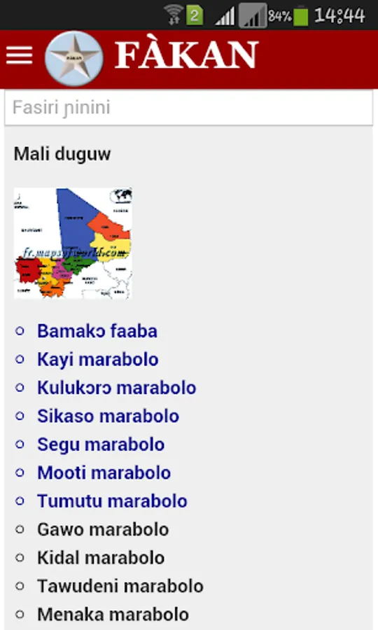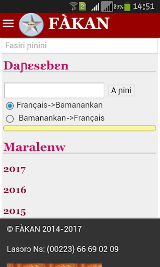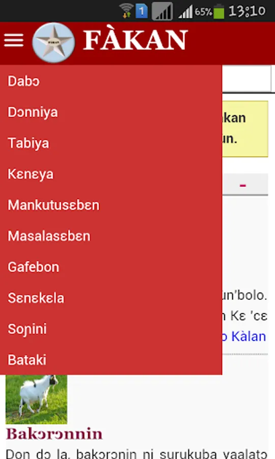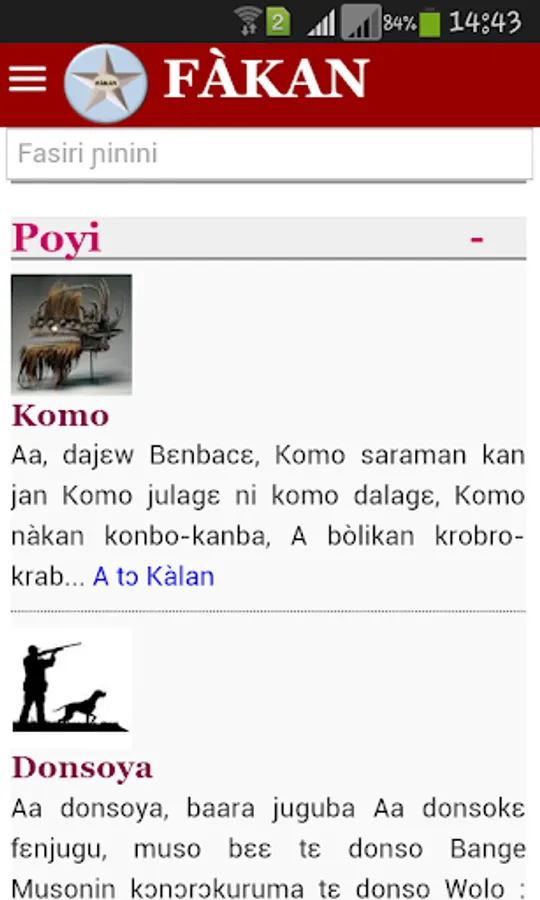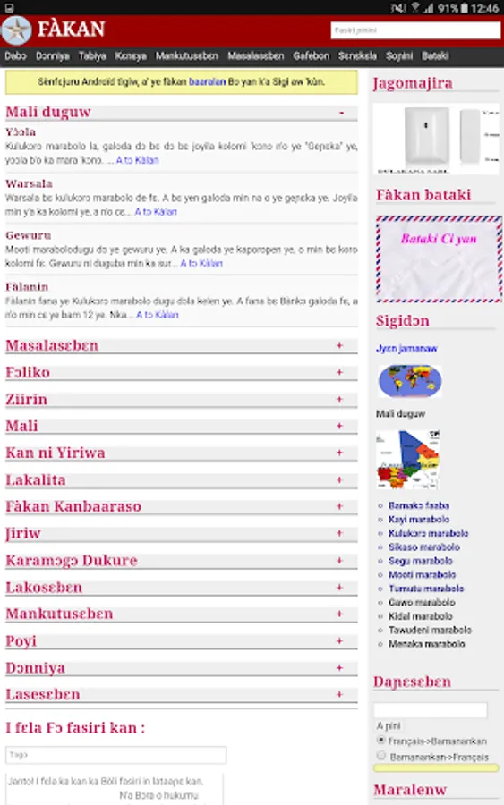 Fakan is an encyclopedic bambara application. It therefore opens a window for speakers of Bamanankan to better immerse themselves in the knowledge that circulates in the network. The application covers several areas. The basic headings are as follows: literature, science, culture, health, e-library, real estate, monography of villages in Mali, plants.
