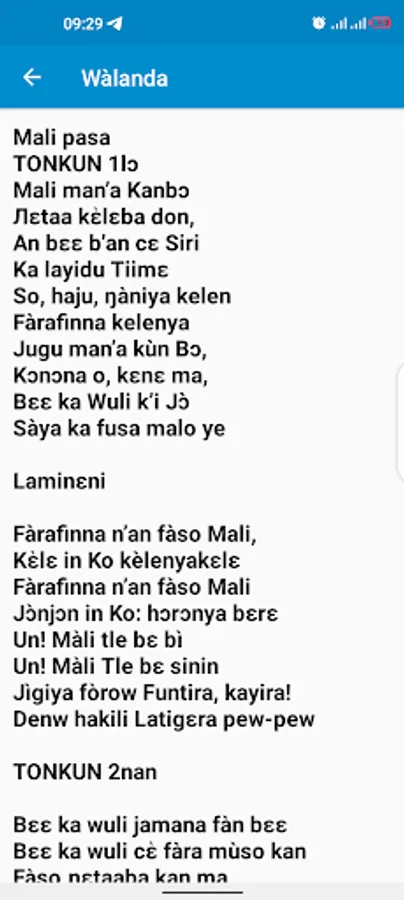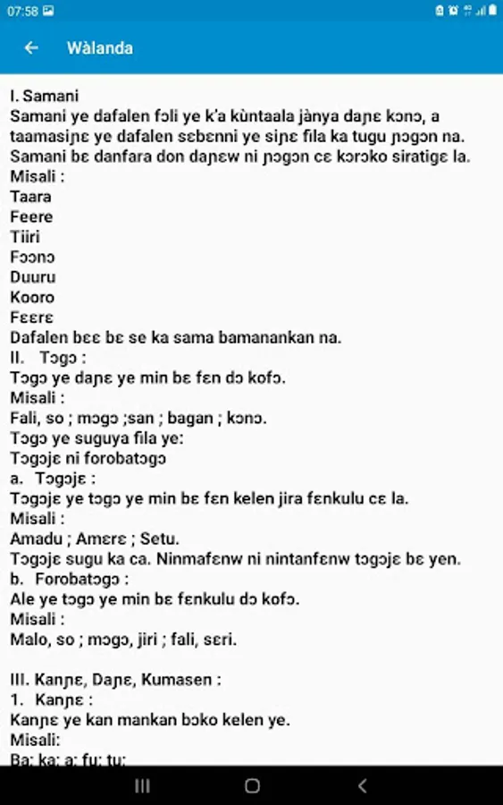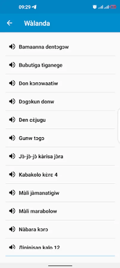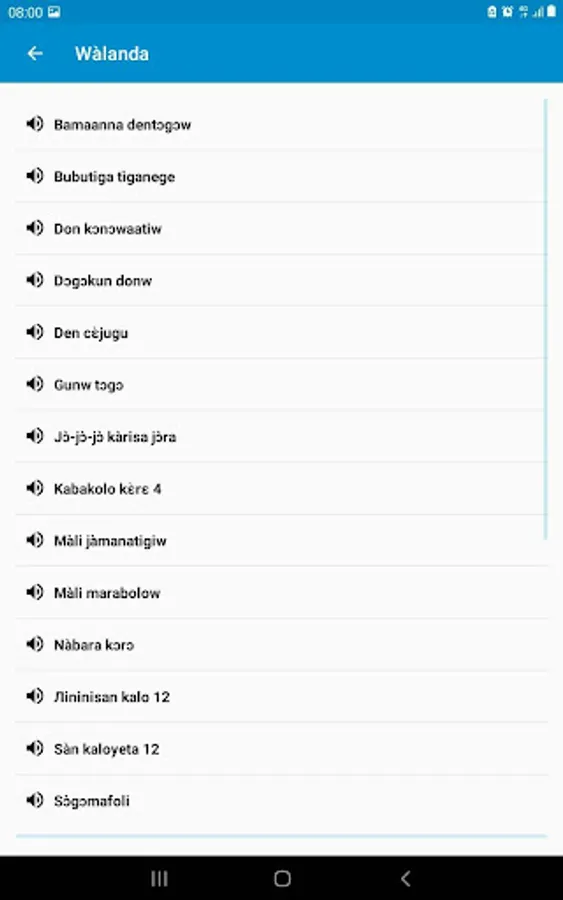 Wàlanda is the tailor-made application that targets Bamanankan speakers who need to learn to write and read the language or speakers wishing to consolidate and deepen their basic level through texts. The application is equally useful for children who do not have Bamanankan as their first language. Our children with language disorders can improve their language from the terminals on which Wàlanda is installed. Malians living abroad can use it to improve the level of their children in Bamanankan and in the cultural topics of Mali. However, Wàlanda does not target adults who have no basic knowledge of Bamanankan.