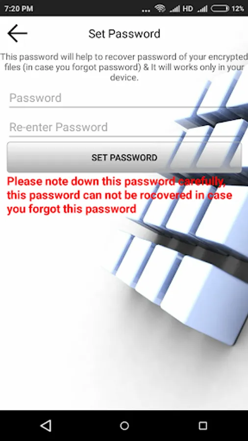 The Fcrypt app will help you to encrypt your files and set a password (the password is the key to unlock your file again).