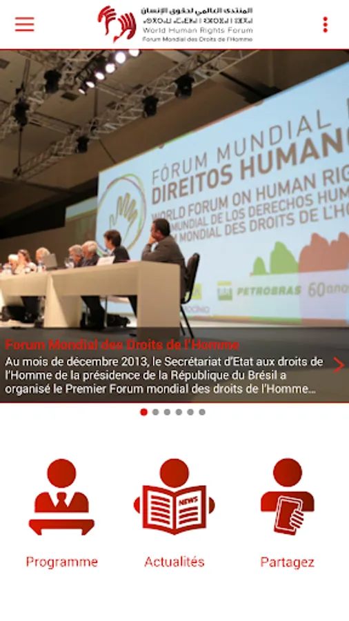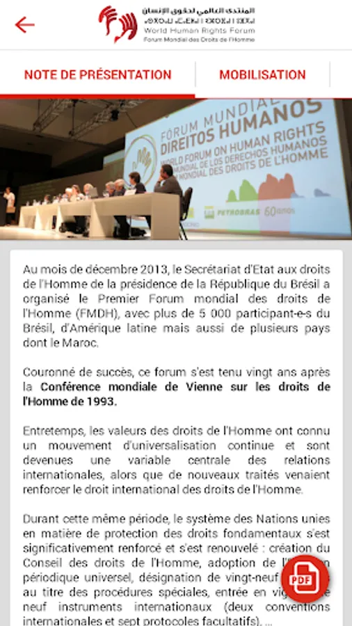 In December 2013, the State Secretariat for Human Rights of the Presidency of the Republic of Brazil organized the First Global Forum on Human Rights (MFHR), with more than 5000 participants are of Brazil, Latin America but also in several countries including Morocco.