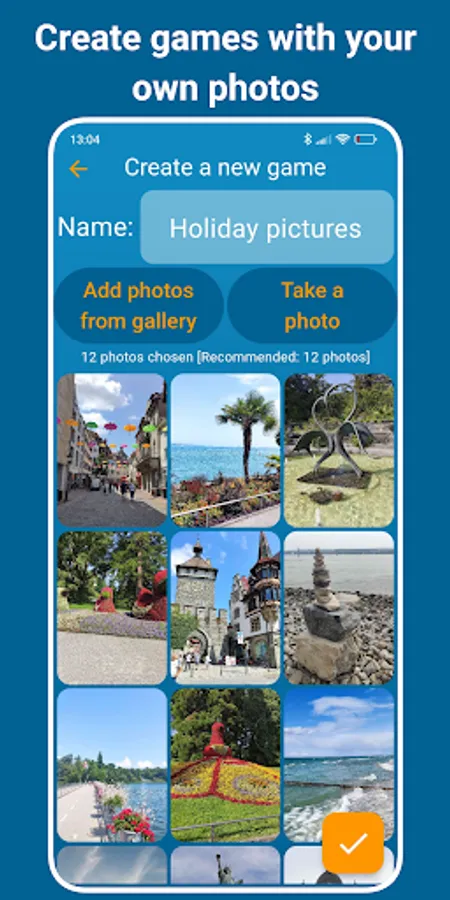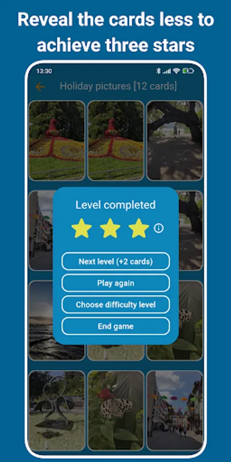 With Photo Match, you have the power to create unique games. Choose photos from your gallery or capture fresh snapshots using your device's camera. Remember the exact positions of the photos and match pairs in the fewest moves possible.