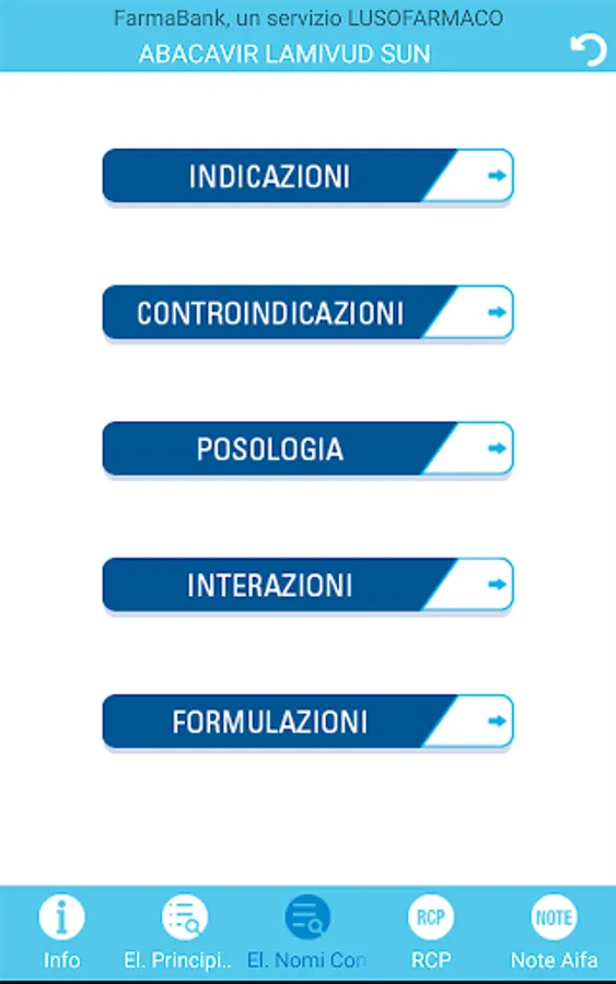 The APP, via the Active Principles tab of the tab bar, presents the alphabetical list of pharmacological active principles. For each Active Principle there is a synthetic exposition concerning: indications, contraindications, posology and interactions. The Formulations button, on the other hand, opens the list of Pharmaceutical Companies that market drugs containing that Active Principle, medicines that are presented by trade name with indication of the packaging, class and price. In Tab Bar you can also view the complete alphabetical list of Commercial Names and there is also a button that accesses the AIFA notes in force.