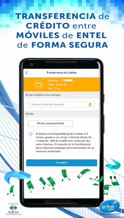 • Credit transfer between Entel mobile phones from 1 to 100 bolivianos.