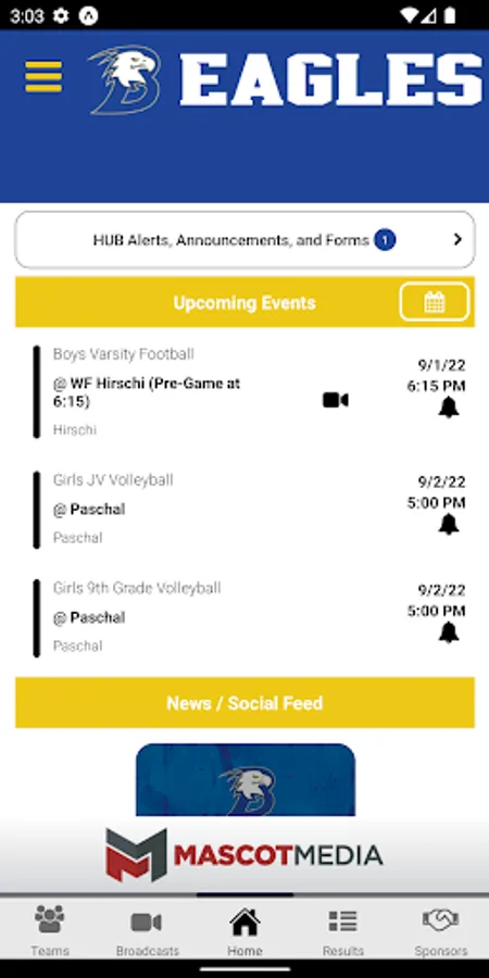 -Active Home Screen Dashboard: Upcoming Games and Recent News.