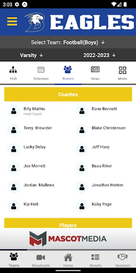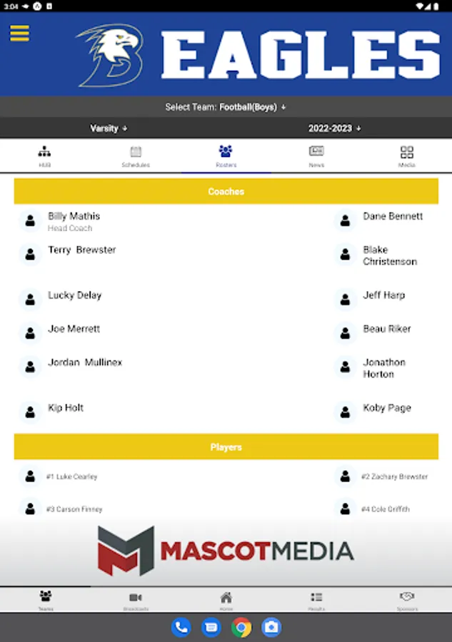 -Rosters: Current rosters by sport including jersey number, name, photo, position and grade.