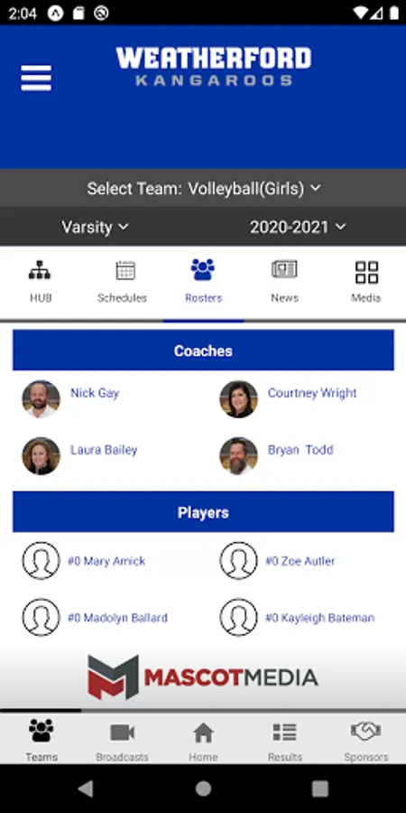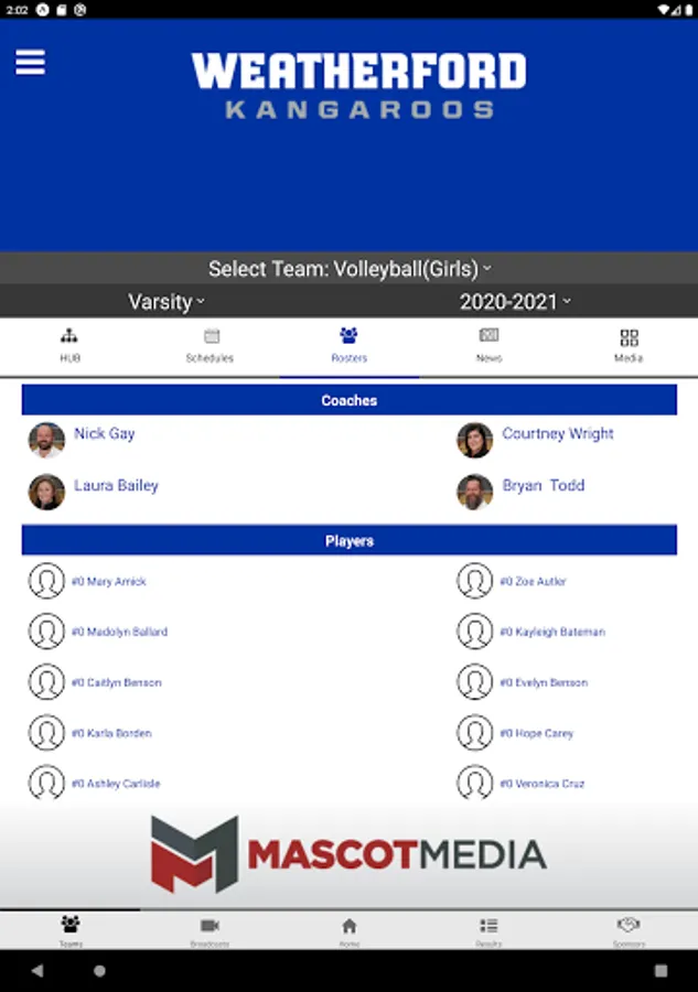 - Rosters: Current rosters by sport including jersey number, name, photo, position and grade.