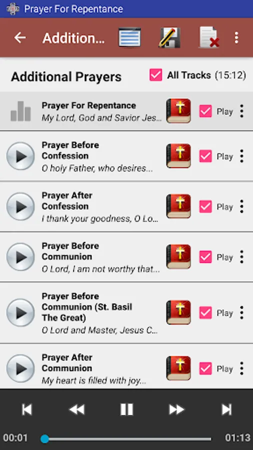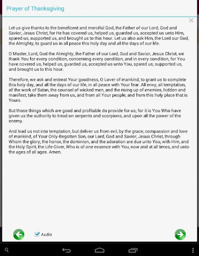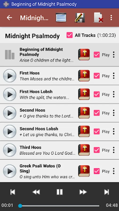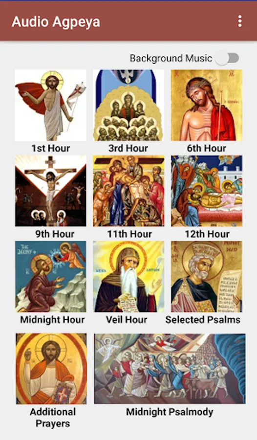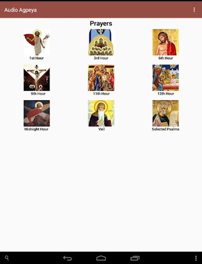 Agpeya is the Coptic Orthodox book of prayers. In addition to text, this application also contains an audio version of these prayers, with a soft musical background (it is possible to turn off the musical background). Agpeya prayers are split into tracks and are separated by hours. User can create customized playlists for each hour, in order to for example, create shorter or longer versions of each hour and/or to vary the psalms in each hour on different days.