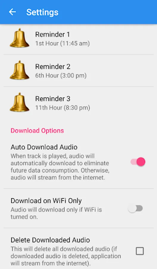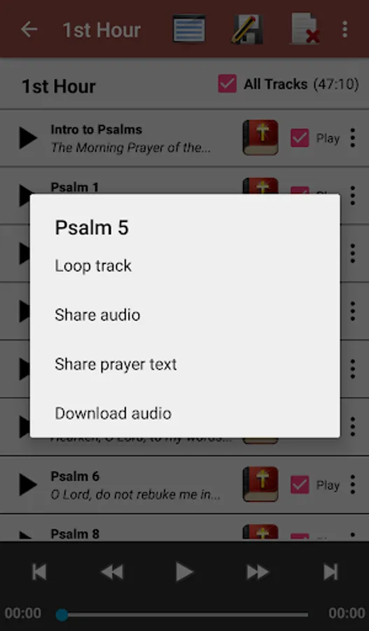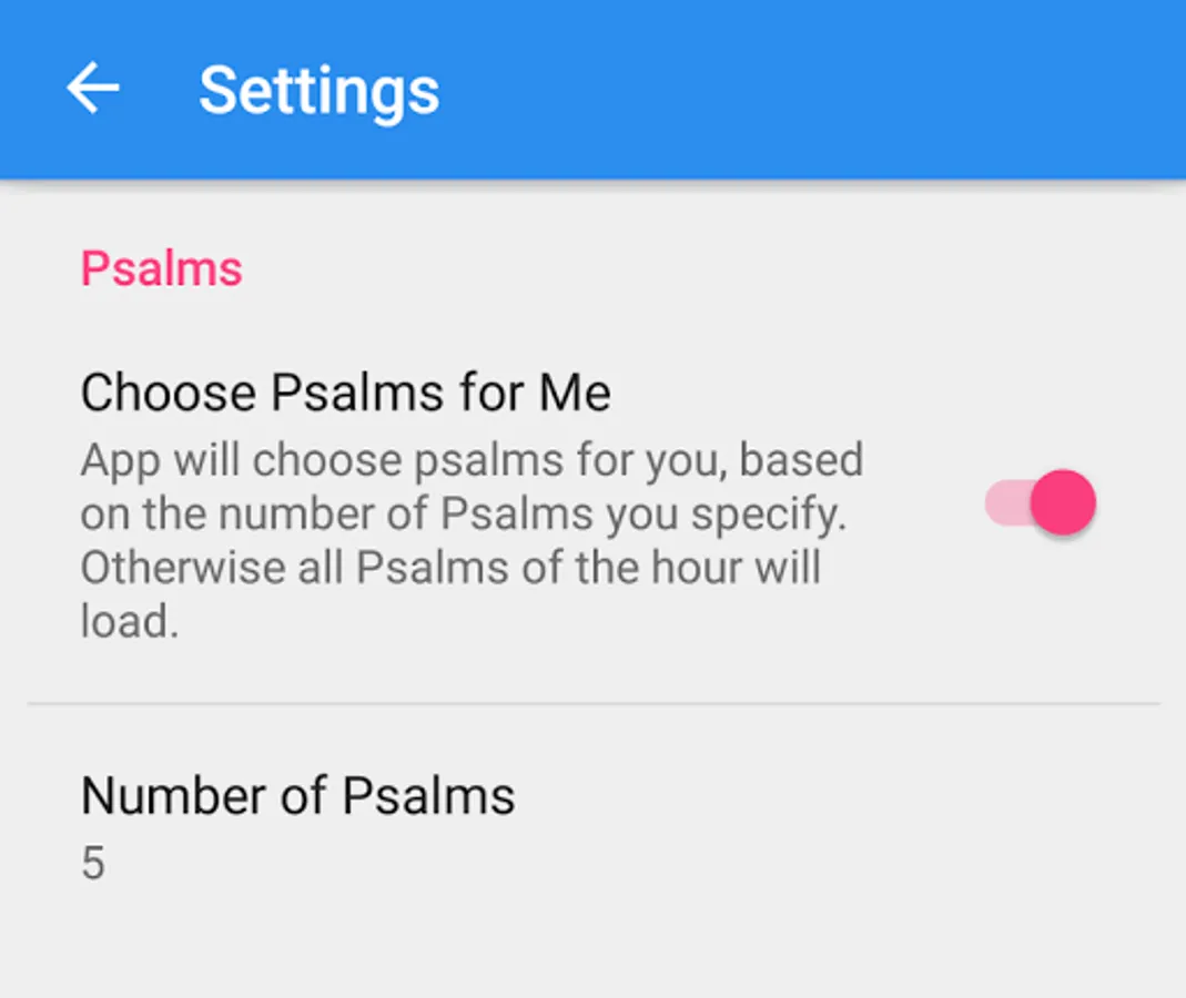 Other features in the app include ability to set prayer reminders; an option to have the app randomly select Psalms for you from each hour (to vary your Psalms every day); ability to loop tracks to help with memorization, and ability to share prayer audio and text.