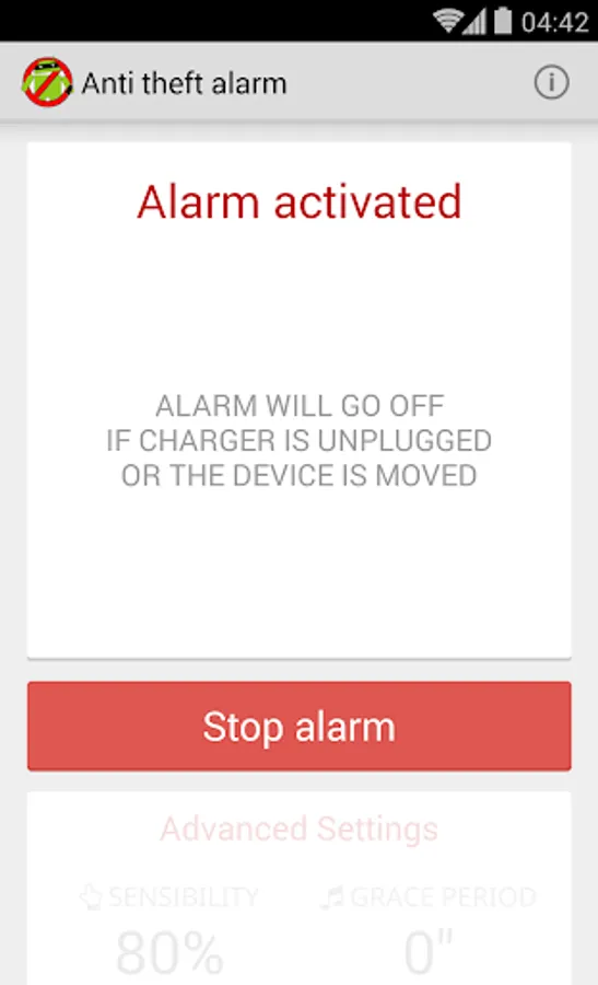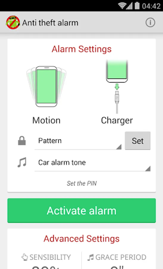 Anti-Theft Alarm will keep your phone safe from nosy people and thieves. Someone moves the phone or disconnects it from the charger? The alarm will sound loudly and you will be immediately aware! And only you can turn off the alarm using personal PIN-code or unlock pattern.