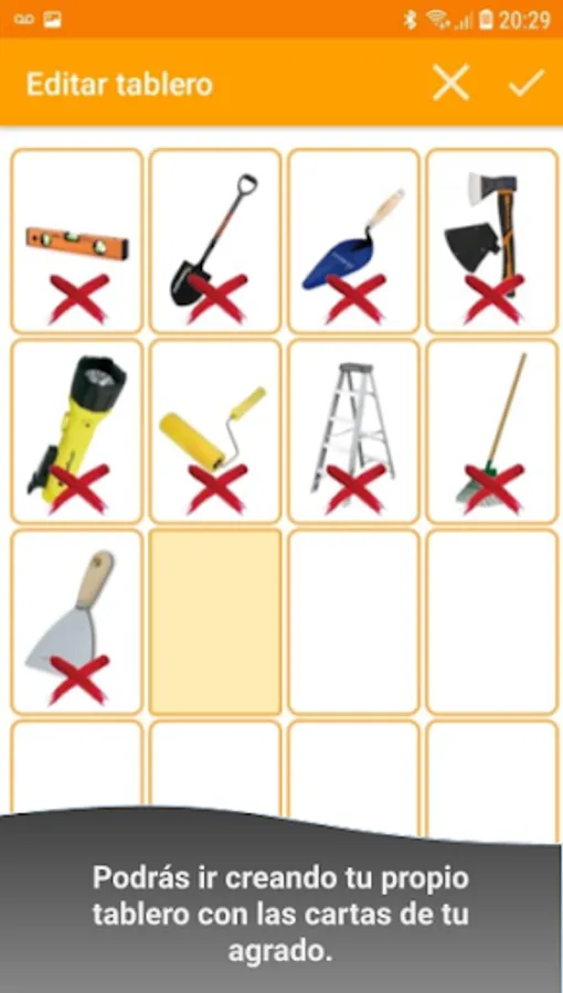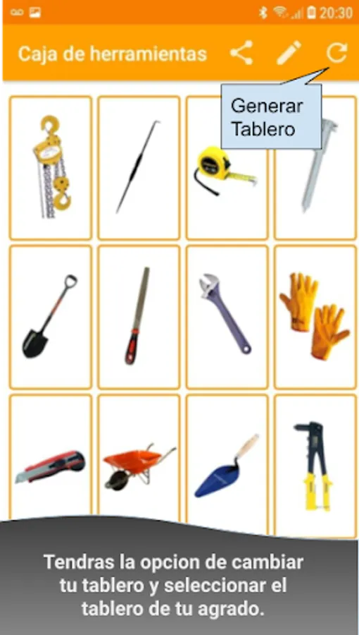Our Card and Deck Tool Lottery shows in each card an image of a tool with a brief description, you can slide the cards, go back to the previous card, or click on the option "Refresh" are some of the actions that we can see in the "Tools". In the scoreboards you will have several boards generated by the APP, you can edit and create your own boards and share your board with your family or friends. On the board, the image will be marked with an image of nails, each player will have to install the application on their device, so it is a game that does not require playing online.