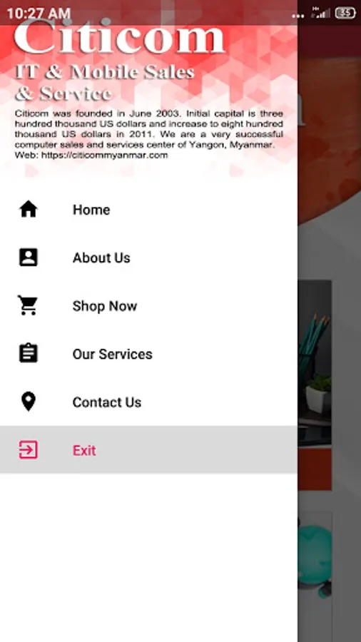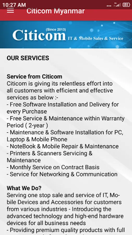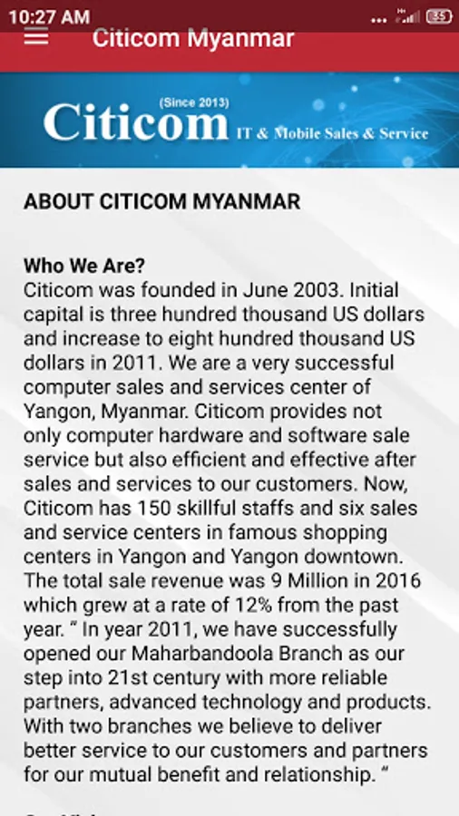 Citicom Myanmar app makes it easy to view IT related products. You can order products via this app. It also describes our business. Citicom was founded in June 2003. Initial capital is three hundred thousand US dollars and increases to eight hundred thousand US dollars in 2011. We are a very successful computer sales and services center of Yangon, Myanmar. Citicom provides not only computer hardware and software sale service but also efficient and effective after-sales and services to our customers. Now, Citicom has 150 skillful staff and six sales and service centers infamous shopping centers in Yangon and Yangon downtown. The total sale revenue was 9 Million in 2016 which grew at a rate of 12% from the past year.