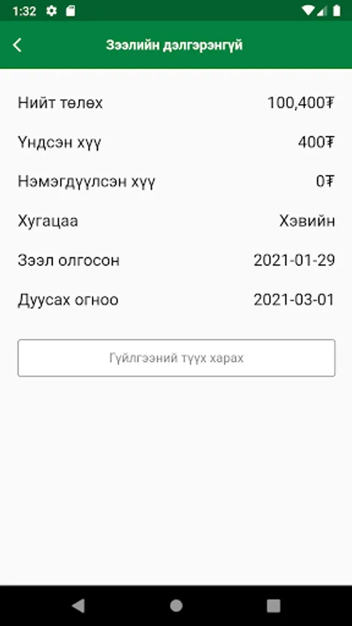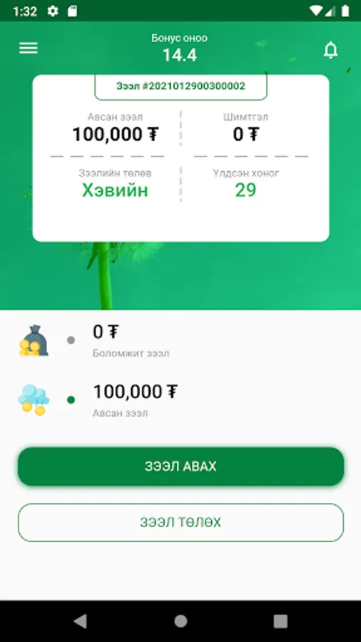 For example, if you borrow 100,000 MNT and repay it within 1 day, you will pay a total of 100,200 MNT, of which the interest payment is 200 MNT, and the principal payment is 100,000 MNT. If repayment is made after a month, 106,000 MNT will be repaid, of which 6,000 MNT will be the interest payment and 100,000 MNT will be the principal payment.