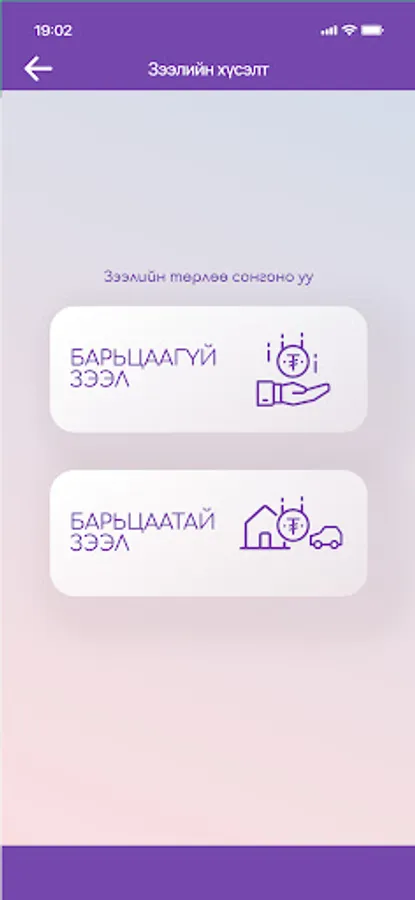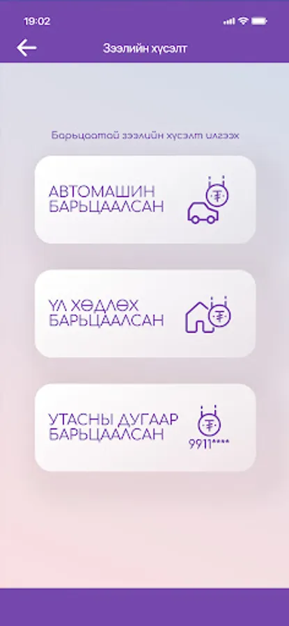 Зээлийн төрөл : Орлого барьцаалсан зээл, Автомашин барьцаалсан зээл, Үл хөдлөх барьцаалсан зээл, Дугаар барьцаалсан зээл.