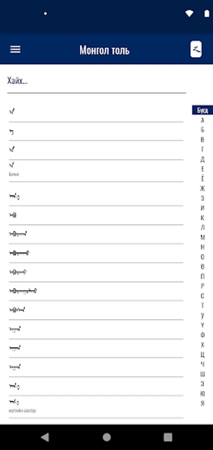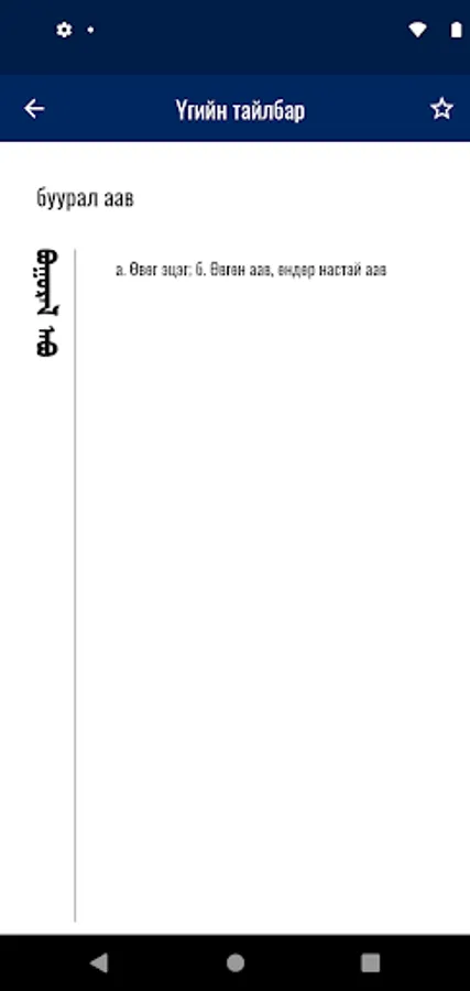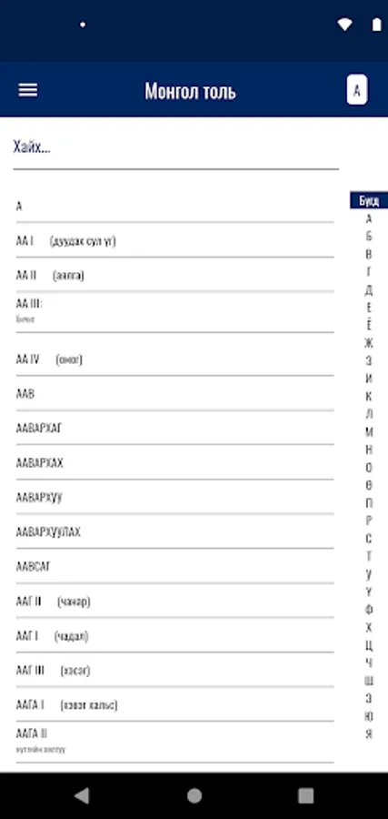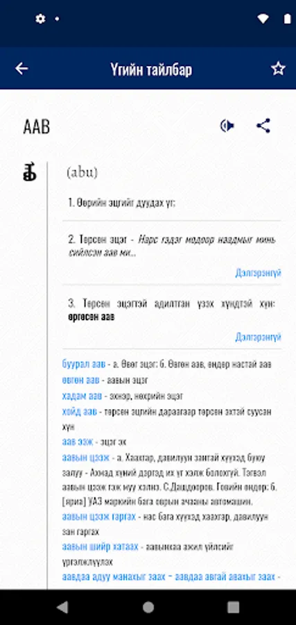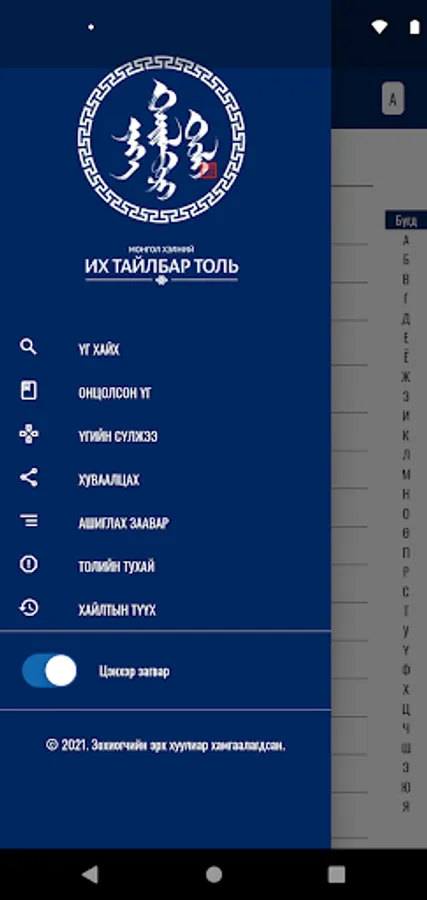 Initiated by the President of Mongolia Tsakhiagiin Elbegdorj and supported by the Office of the President, in 2016 the researchers of the Institute of Linguistics of the Academy of Sciences organized the “Great Dictionary of the Mongolian Language” with more than 60,000 headwords and 80,000 related words from the Mongolian language vocabulary. This time, we are updating the mobile version of the dictionary with the support of the Ministry of Culture.