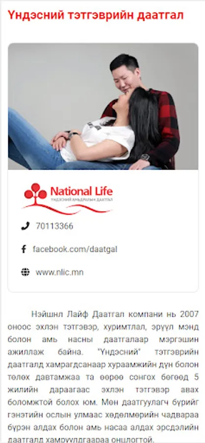 Нэйшнл Лайф Даатгал нь 2007 оноос эхлэн Амьдралын даатгал буюу урт хугацааны даатгалаар мэргэшин ажиллаж байна. Бид хэрэглэгч, харилцагч бүрийнхээ хэрэгцээ шаардлагад нийцсэн даатгалын бүтээгдэхүүн, үйлчилгээг санал болгохыг зорин ажиллаж байна. Иймд хэрэглэгчиддээ хялбар байдлыг бий болгон тэдэнд зориулсан аппликейшнийг санал болгож байна.