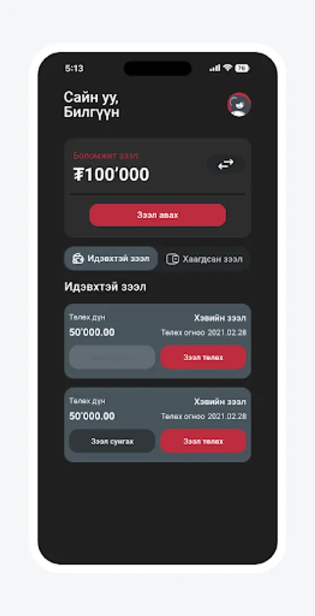 For example, if you borrow 100,000 MNT and pay it back within 1 day, you will pay 100,200 MNT. Interest rate of 0.2 percent per day will be calculated. If repayment is made after a month, 106,000 MNT will be repaid.