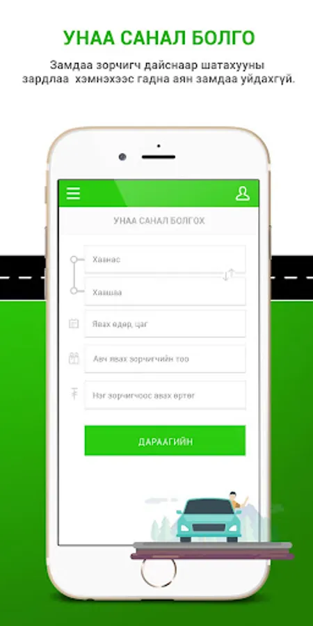 - “+” дүрс бүхий Жолооч товчлуурыг дарж аяллын мэдээллээ оруулан унаагаа хормын дотор санал болгоно