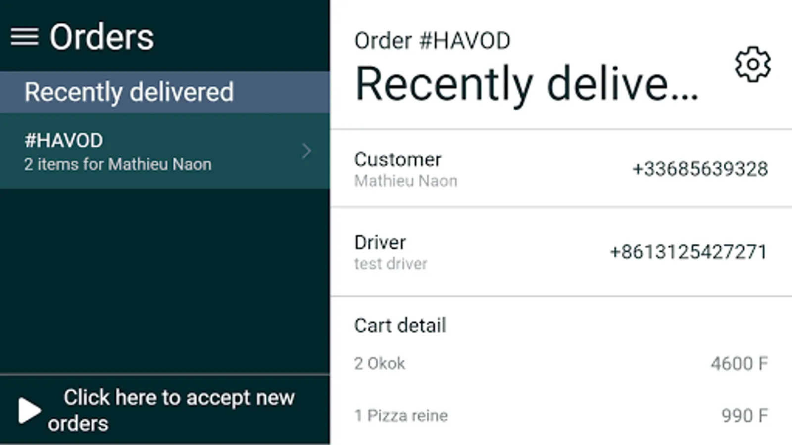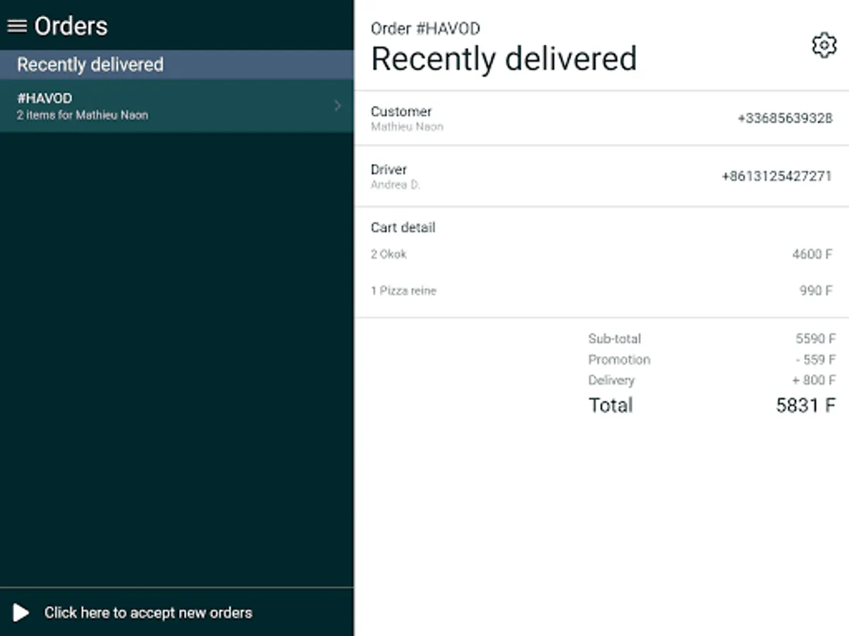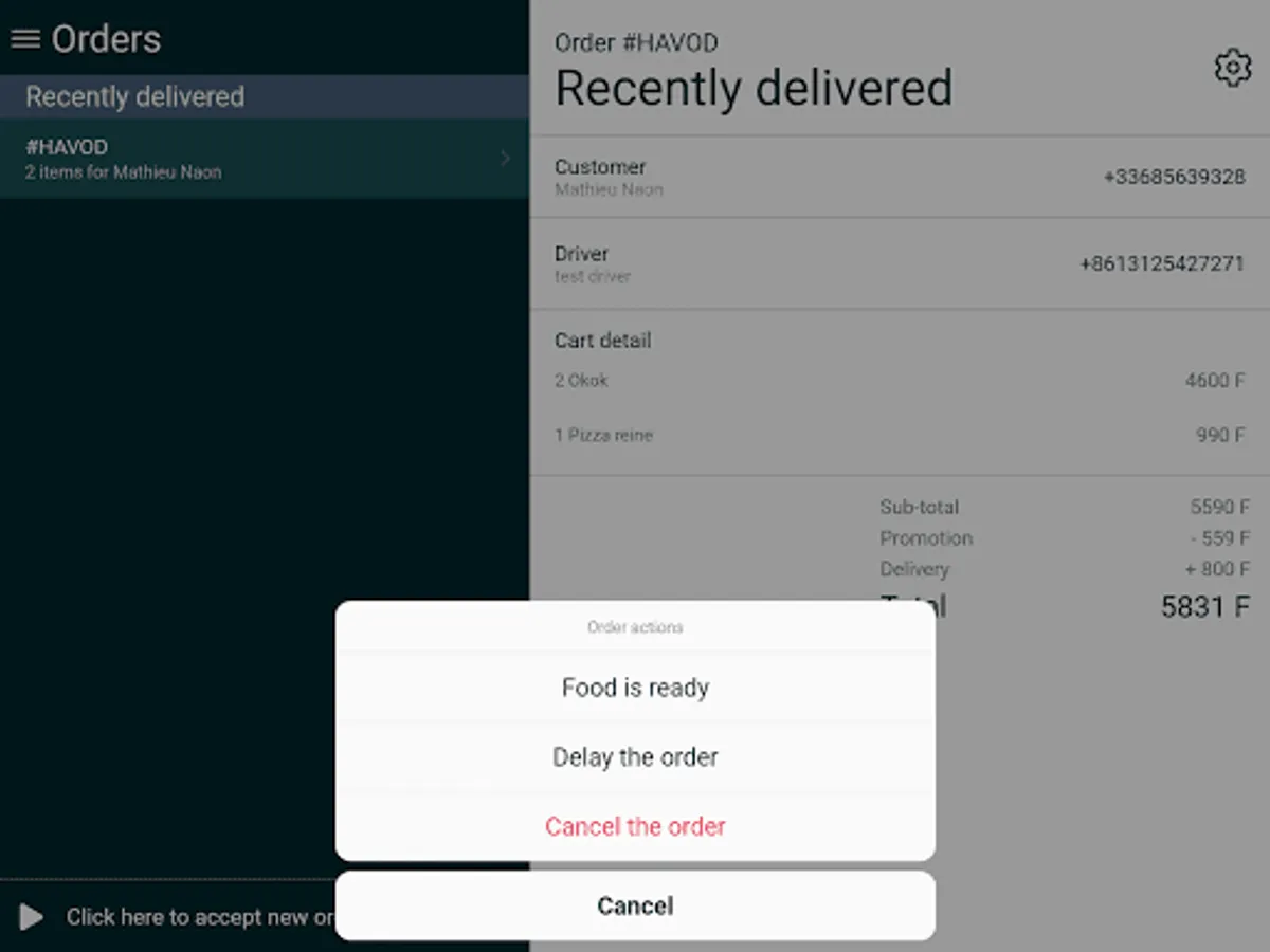 The merchant application of the Noumo Delivery service allows you, as a restaurant or supermarket, to manage your orders and your stock available on the consumer application.