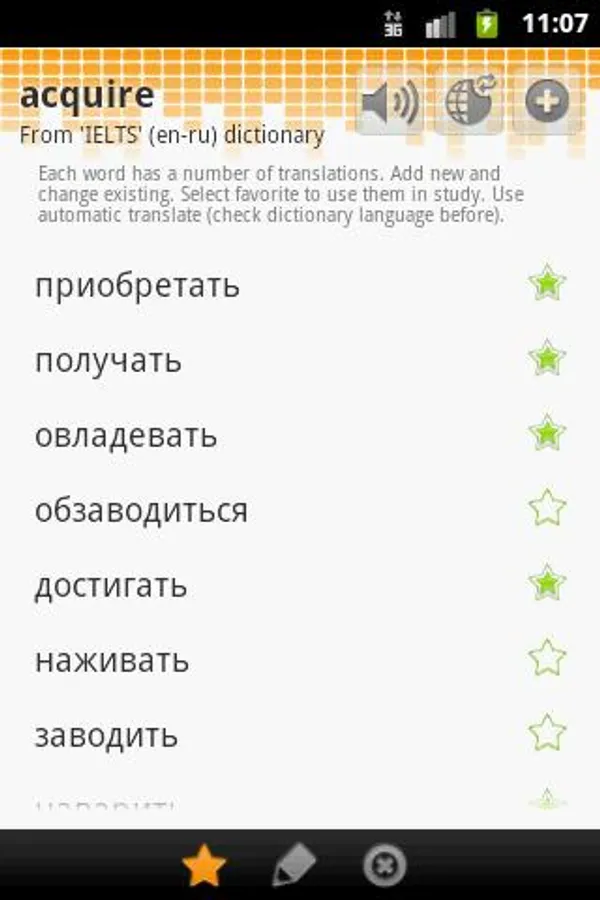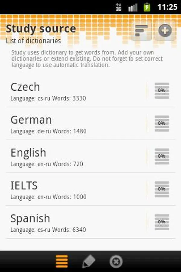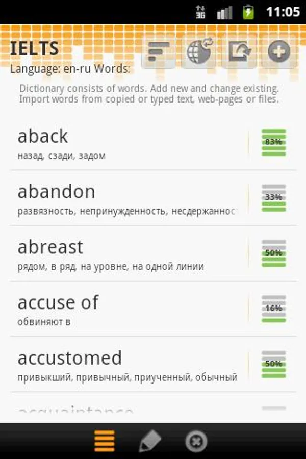 Import words from everywhere, translate them on the go and learn with the help of four different study types. It is easy to open web site on desired language and import all content to your own dictionary. Automatic translation protects you from manual searching and typing.