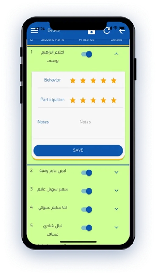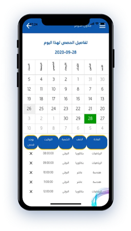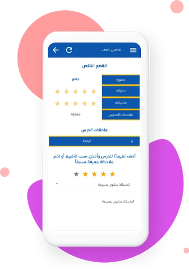 An application to manage school students through attendance dates for each student, class schedule, examination results, monitoring student attendance or absence by a copy of the application for the student’s family that enables them to follow up on their son’s study status around the clock