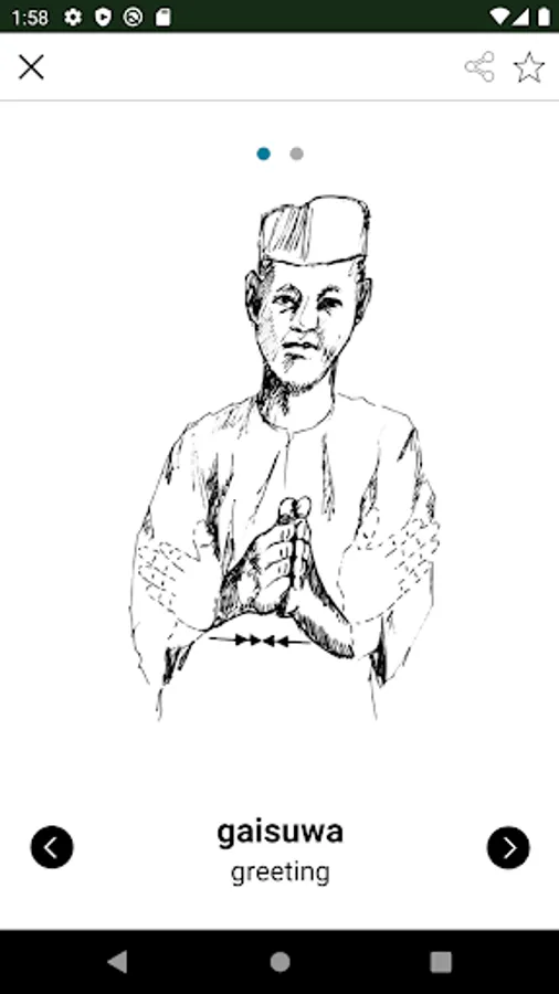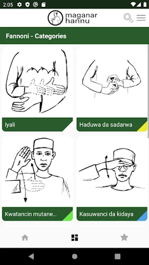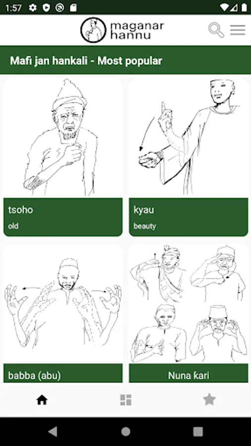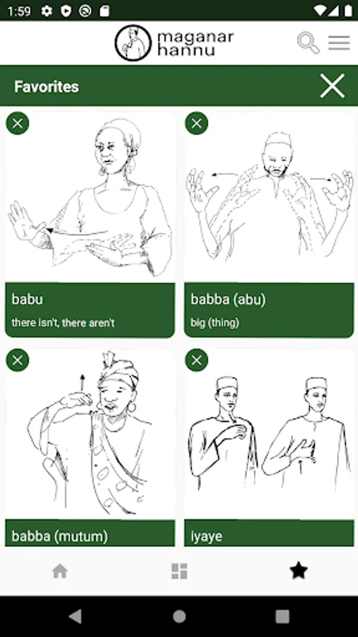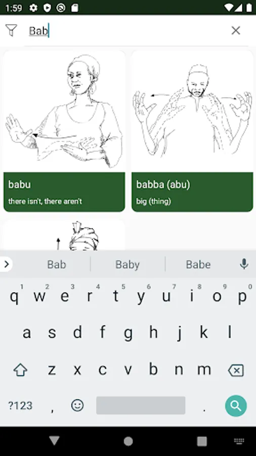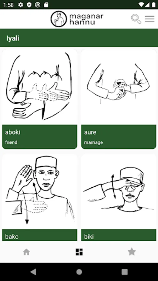 This dictionary of Hausa Sign Language contains around 500 signs, each with a translation into spoken Hausa and English. The signs are arranged in thematic fields. The search button allows you to find signs by typing in words in either language. All pictures are built into the application so that they can be viewed offline.