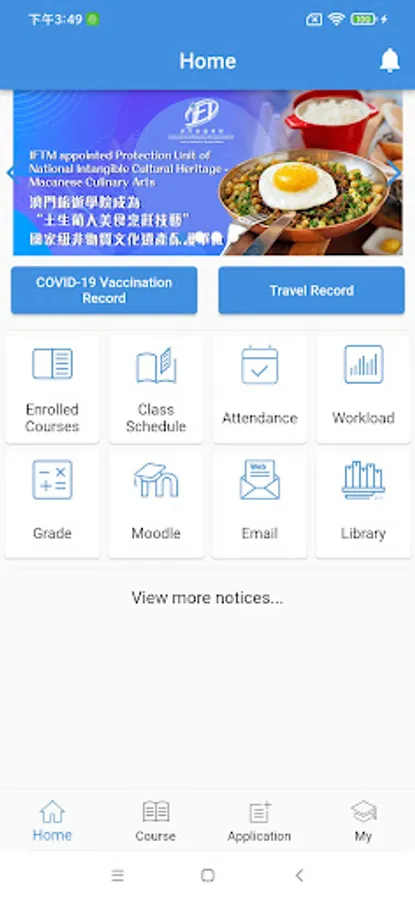 1. Home page: Students can receive push notifications of IFTM’s latest news, view institute announcements, check vaccination status and access other general functions, etc.