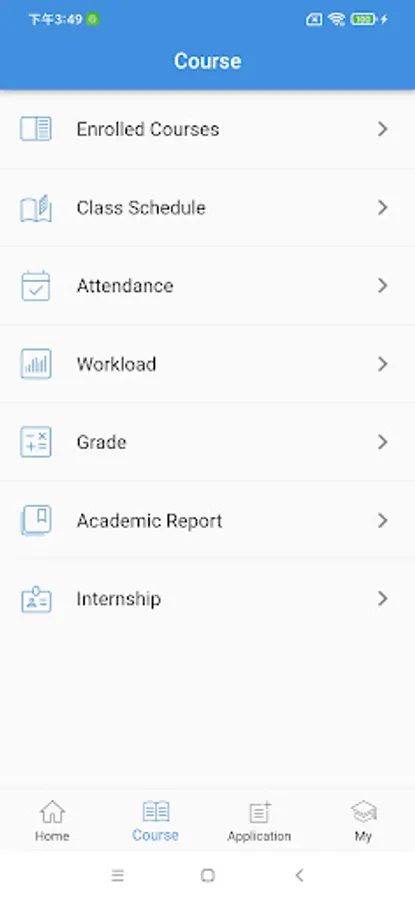 2. Course: Students can check the status of enrolled courses, class schedules, attendance rates, grades and thesis proposals, etc.