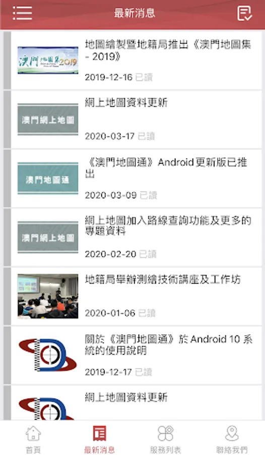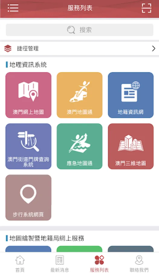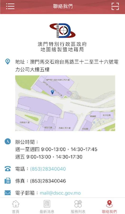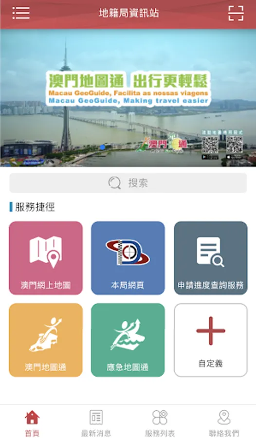 The “Information Center of DSCC” is a mobile application (APP) launched by the Cartography and Cadastre Bureau (DSCC). The application is a comprehensive platform of DSCC that offers online process inquiry service and the latest geographic statistics, as well as built-in geographic information systems links including “Macao Online Map”, “Cadastral Information Website”, “Macau GeoGuide”, “GeoGuide for Emergency”, “Macao 3D Map” and “The Walking Routes Map” etc., providing services and the geographic information of Macao to the public in a convenient way.