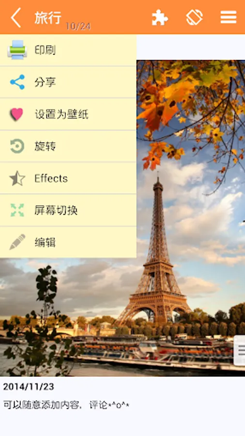 Photo classification, slide shows, share with friends, set up dynamic wallpaper, adding a log to your photos, as well as various settings.