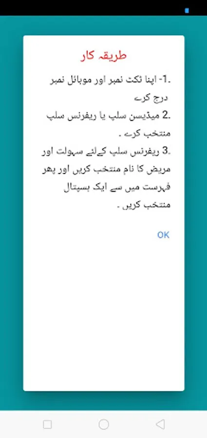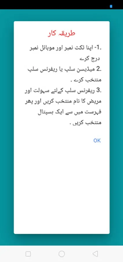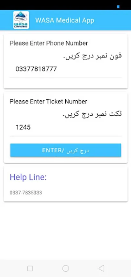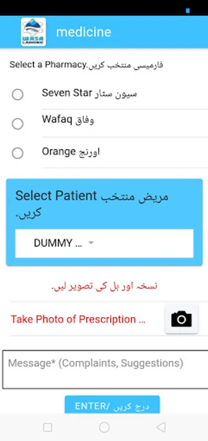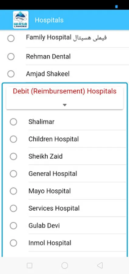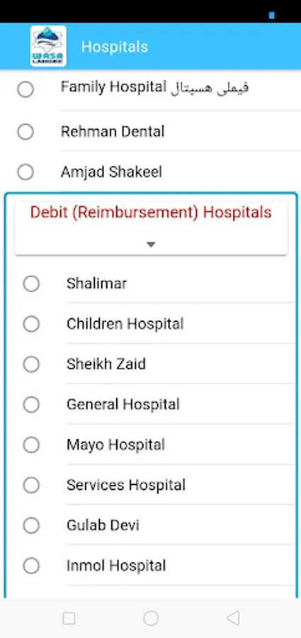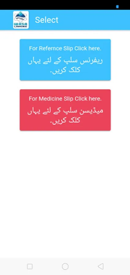 Application by Medical Office, WASA, LDA for WASA Employees to send slip requests using a smart phone. Employees must enter a valid ticket number, CNIC number and mobile number and then they can select a hospital or pharmacy, they want to visit. The user must provide a doctor's prescription for tests and medicine using his phone camera.