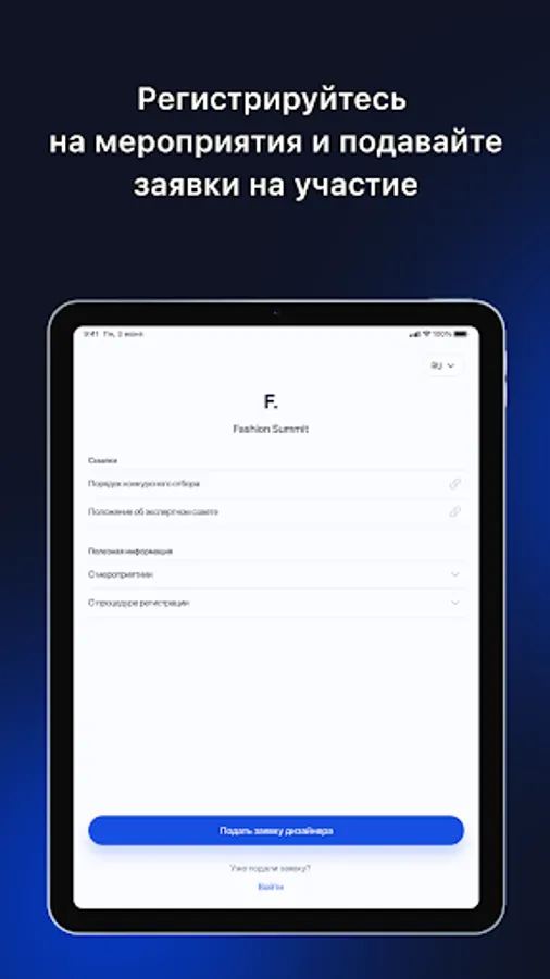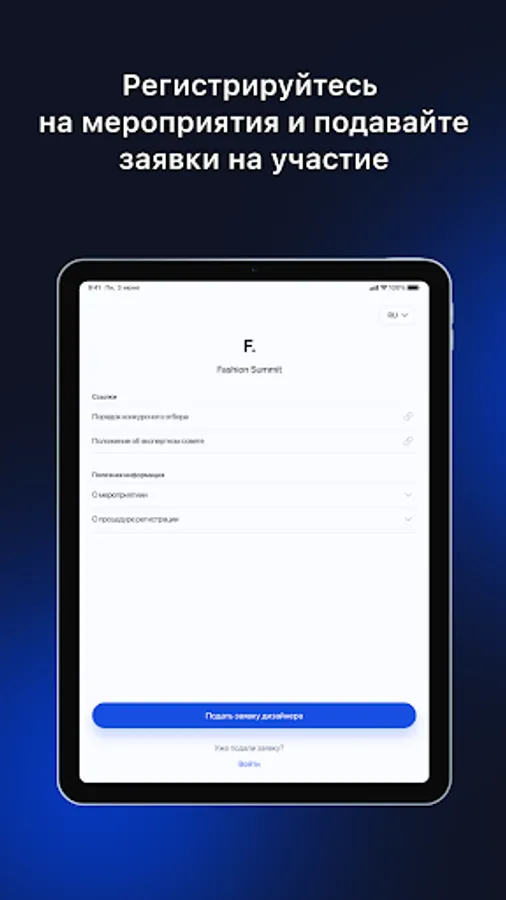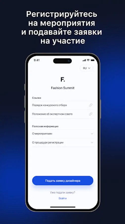 An application for fashion industry professionals: designers, models, stylists, reviewers, buyers, etc. Registration for specialized events, application for participation, and soon - public portfolios, chat, search for industrial contacts for cooperation and friendly relations with Fashion Summit participants .