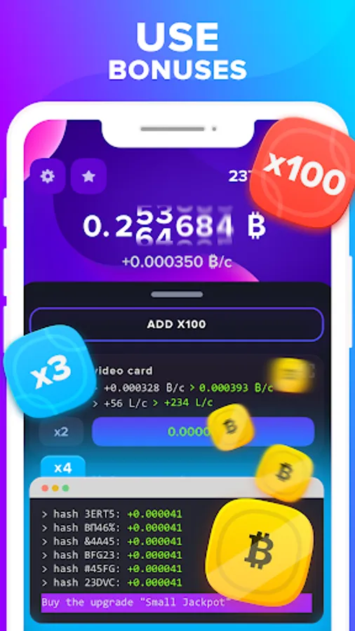 Catch your luck and get accelerated Bitcoin(game currency) mining. Ask the hackers for some help and they will double the number of earned Bitcoins(game currency) per minute. Upgrade your hash decryption and get instant profits!