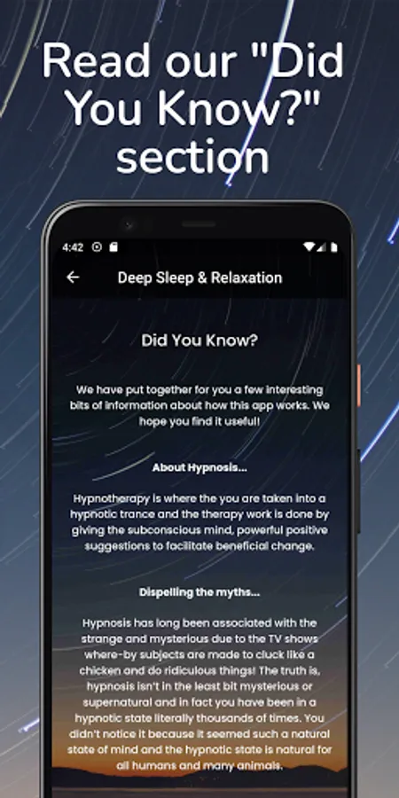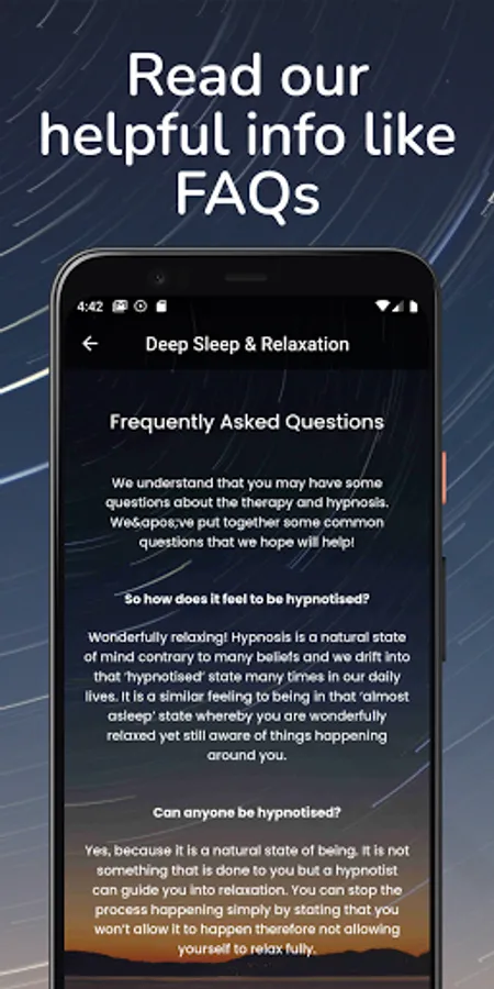 This hypnosis app has been professionally recorded using state of the art digital recording technology. It includes background sound effects, hypnotic music composed specifically to induce deep relaxation and voice echoes to create a wonderfully relaxing deep trance.