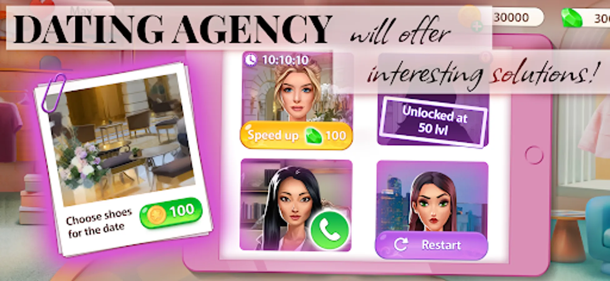 Here you can influence clothing design and relationships in game. Your Dating Agency isn't just about love games and intrigues, it's also a business that will bring you income, that you can invest in new outfits and the store decoration!