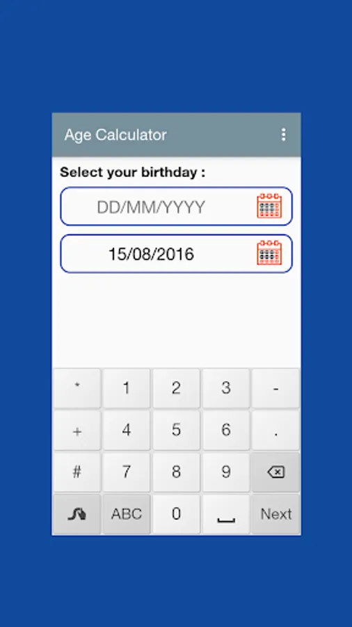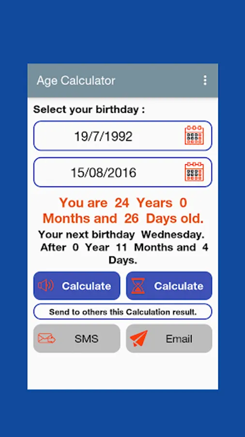 Calculate your ages quickly and accurately and see years, months, and days values. Easily date pic from calendar by click calendar icon. Listen voice calculation result of your Age. Get next birthday date and name of day.