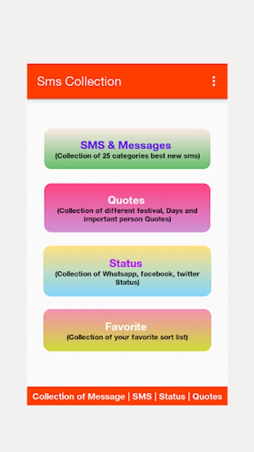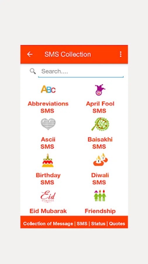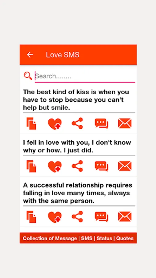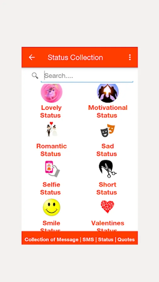Message and status in category wise with easy searching system. Fully working offline and easy to send, share, email, copy and add to favorite list.