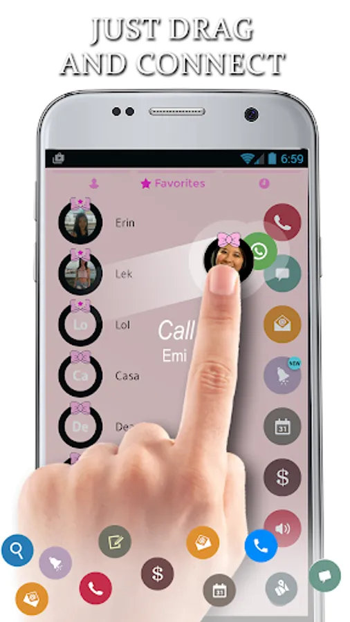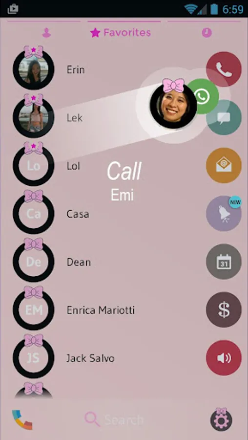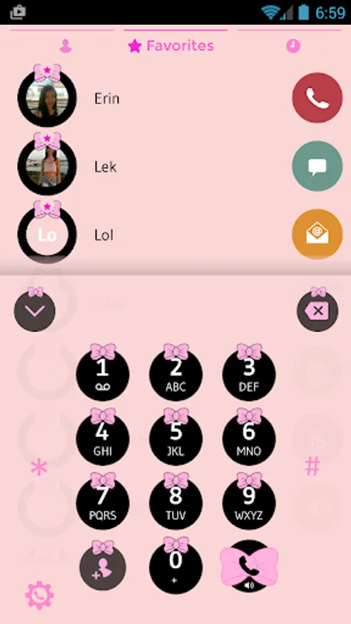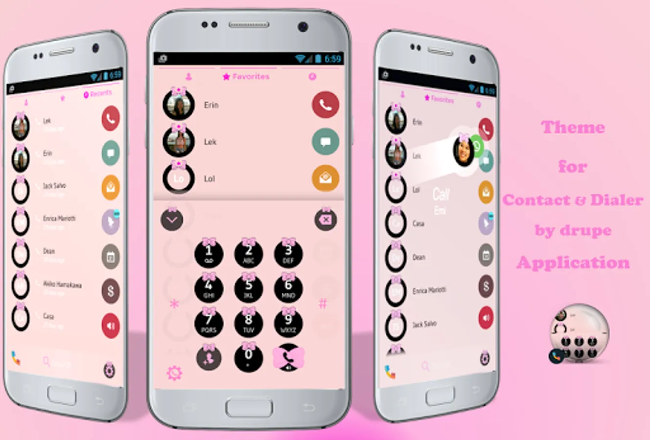 Give your phone that cute feeling with our beautiful ribbon theme for drupe contacts phone dialer application. This is a dialer and contact manager theme with black cute buttons decorated with a lovely pink ribbon on top of a colorful pastel pink background. You will love viewing your phonebook and making calls with this cute lovely theme for drupe Contacts & Dialer application: please install drupe Contacts Phone Dialer main program to use this theme.