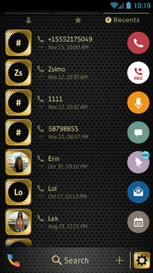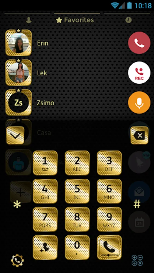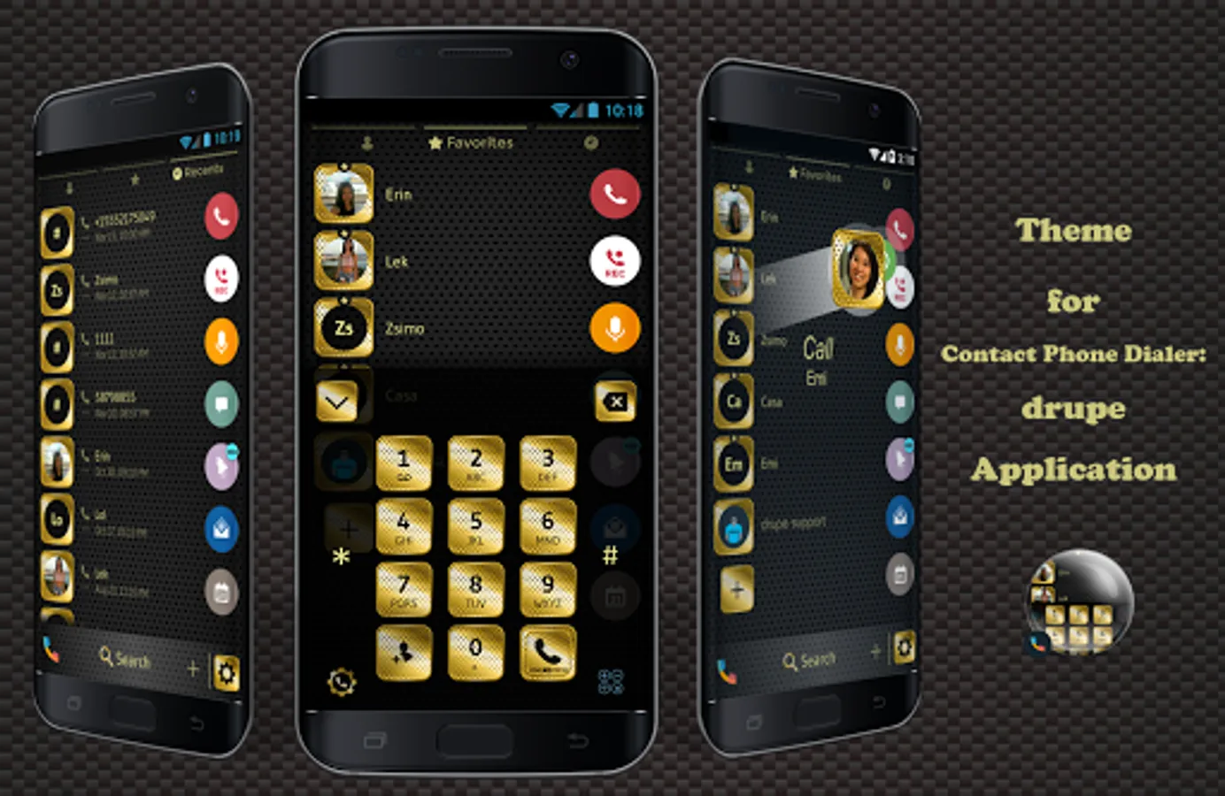 Give a rich and sleek look to your phone! Gold pattered perforated buttons and a dark pattern background to show your precious and smart personality with this classic free theme for drupe Contacts & Dialer application.