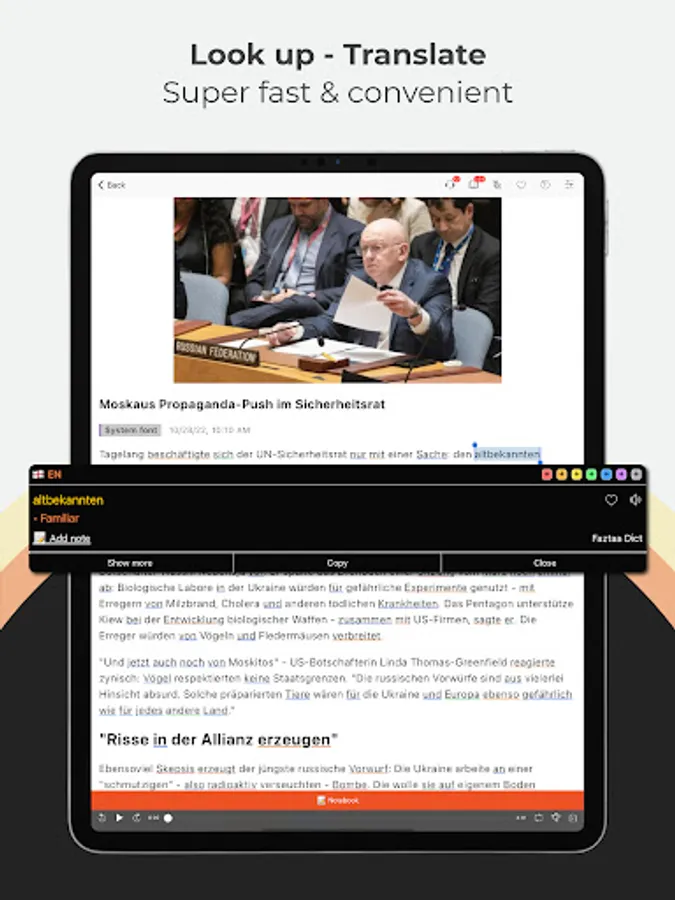 - Look up vocabulary, idioms, sentence structures, and grammar breakdowns.