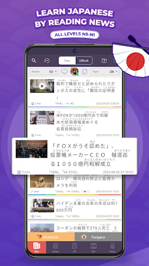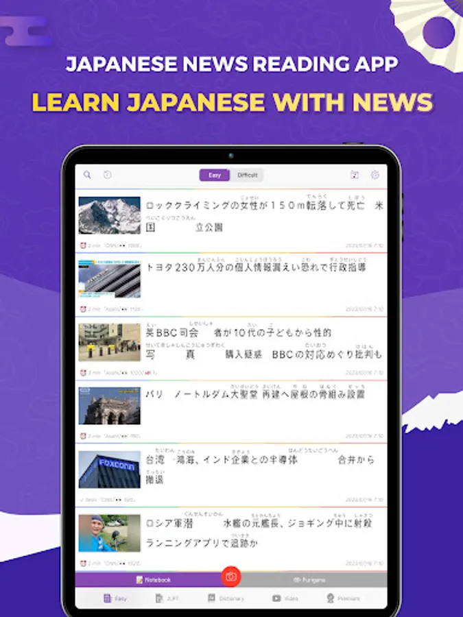 • Difficult news: Challenge yourself with advanced Japanese articles. Suitable for intermediate Japanese learners with JLPT level N3, N2 and N1.