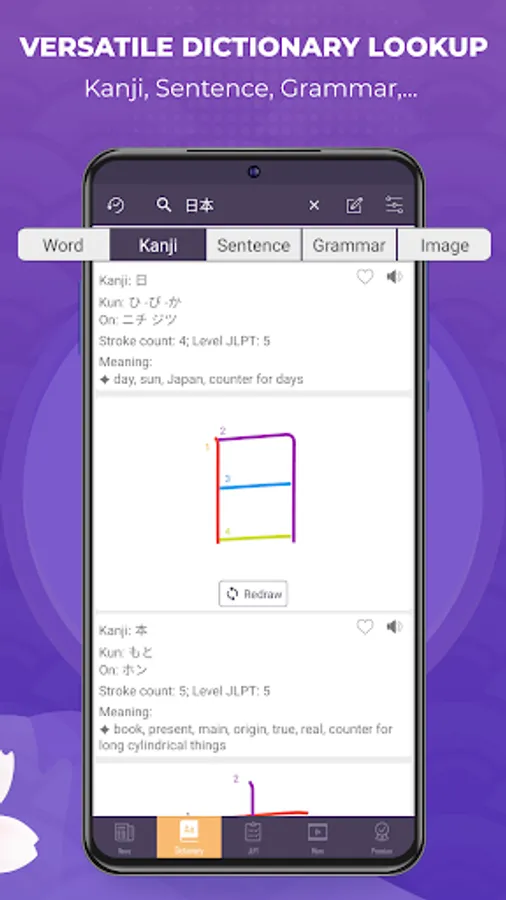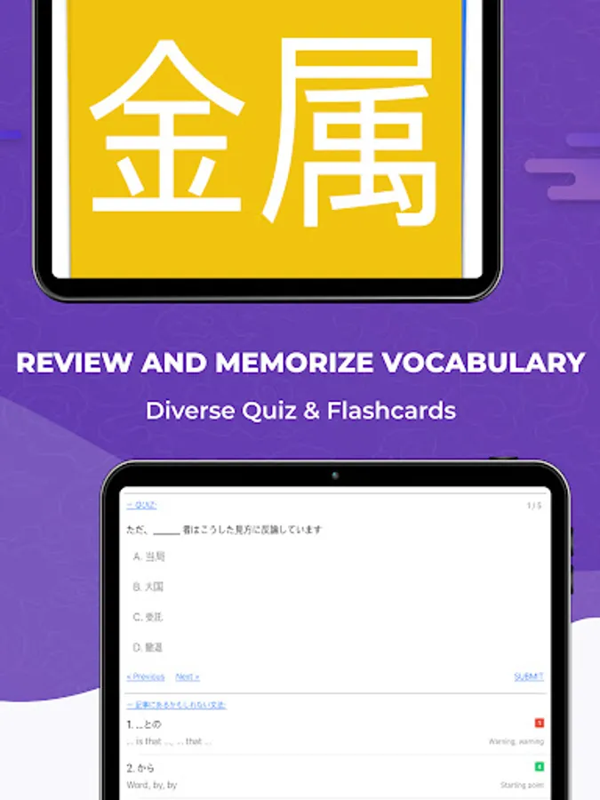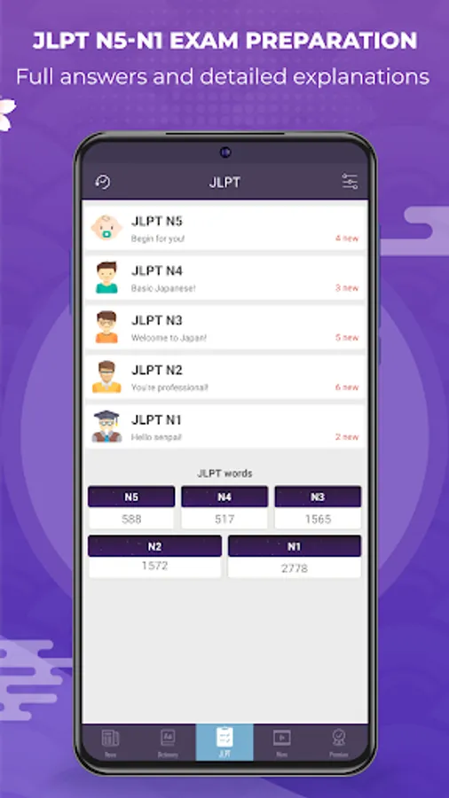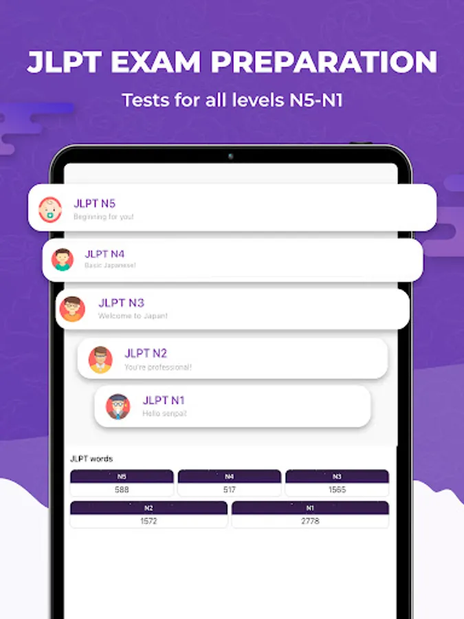 • JLPT mock test: Take 35+ JLPT mock tests with full levels N5-N1. Standard JLPT tests with structure like real JLPT exams.