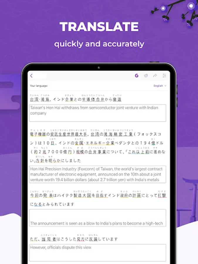 Practice translating the article from Japanese to your language and share it with other learners; refer to the translations of other users or use a quick Japanese dictionary available to look up any vocabulary directly in the article with just one touch.