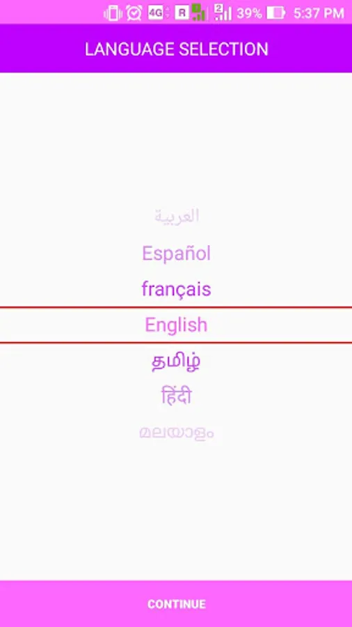 Menu -> Language Change -> Foreign Languages -> Arabic,Chinese,English(Default),French,Spanish, & Indian Languages -> Hindi,Malayalam,Tamil,Telugu.
