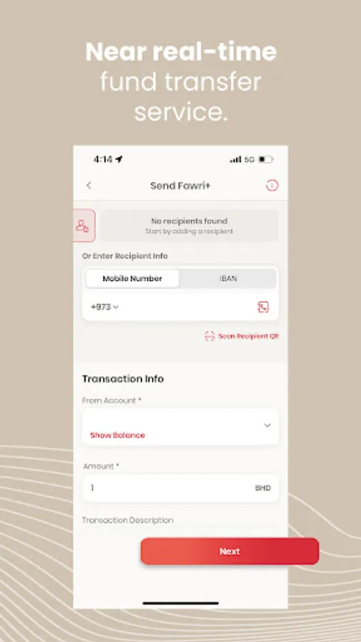 · Transfer funds instantly from one bank account to another using Fawri+ service by either entering IBAN, or a registered mobile number, as well as by scanning QR Code.